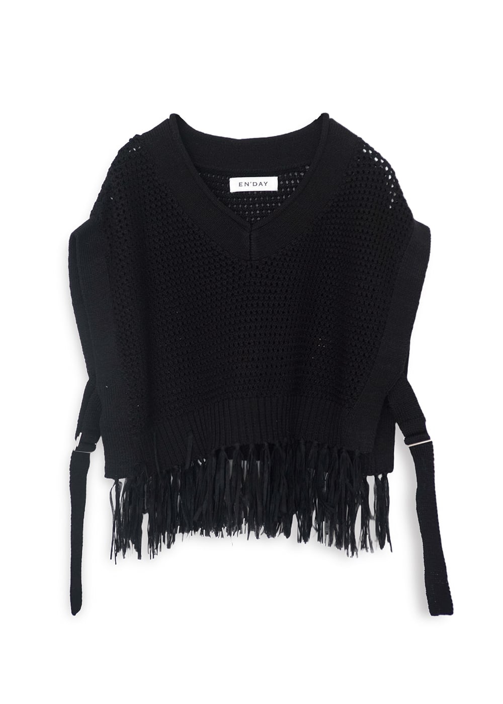 涼しげな編み地に映えるフリンジが軽やかに揺れ、印象的なアクセントになるニットベスト。