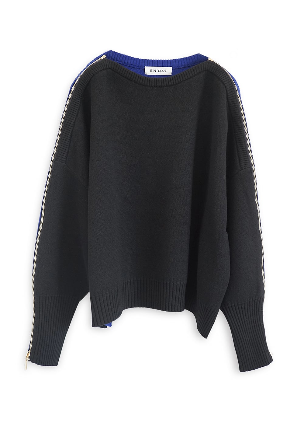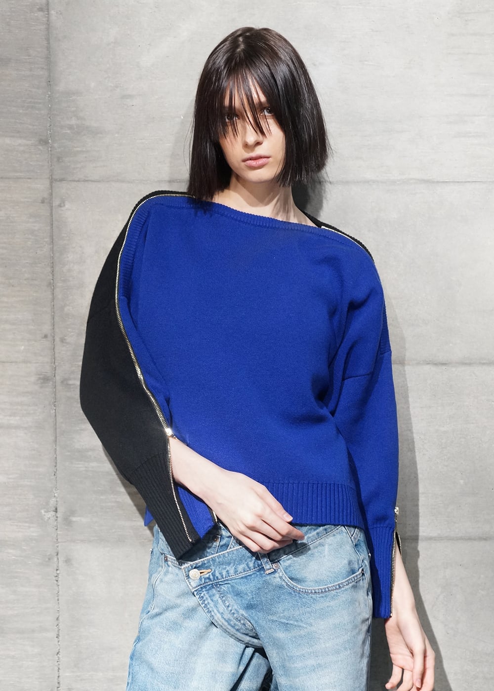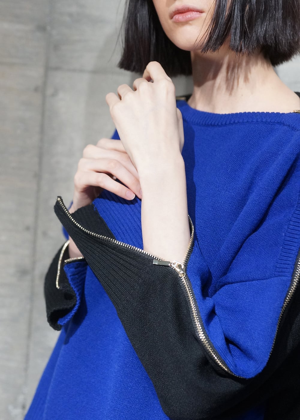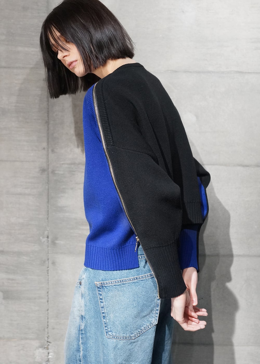 肩から袖口までのファスナーは、袖口を開けるとスリットスリーブ風に軽やかに揺れる表情に変化。パンツにはリラックス感を添え、スカートには動きのあるモード感をプラス。着こなしの幅がぐっと広がるアクセントに。