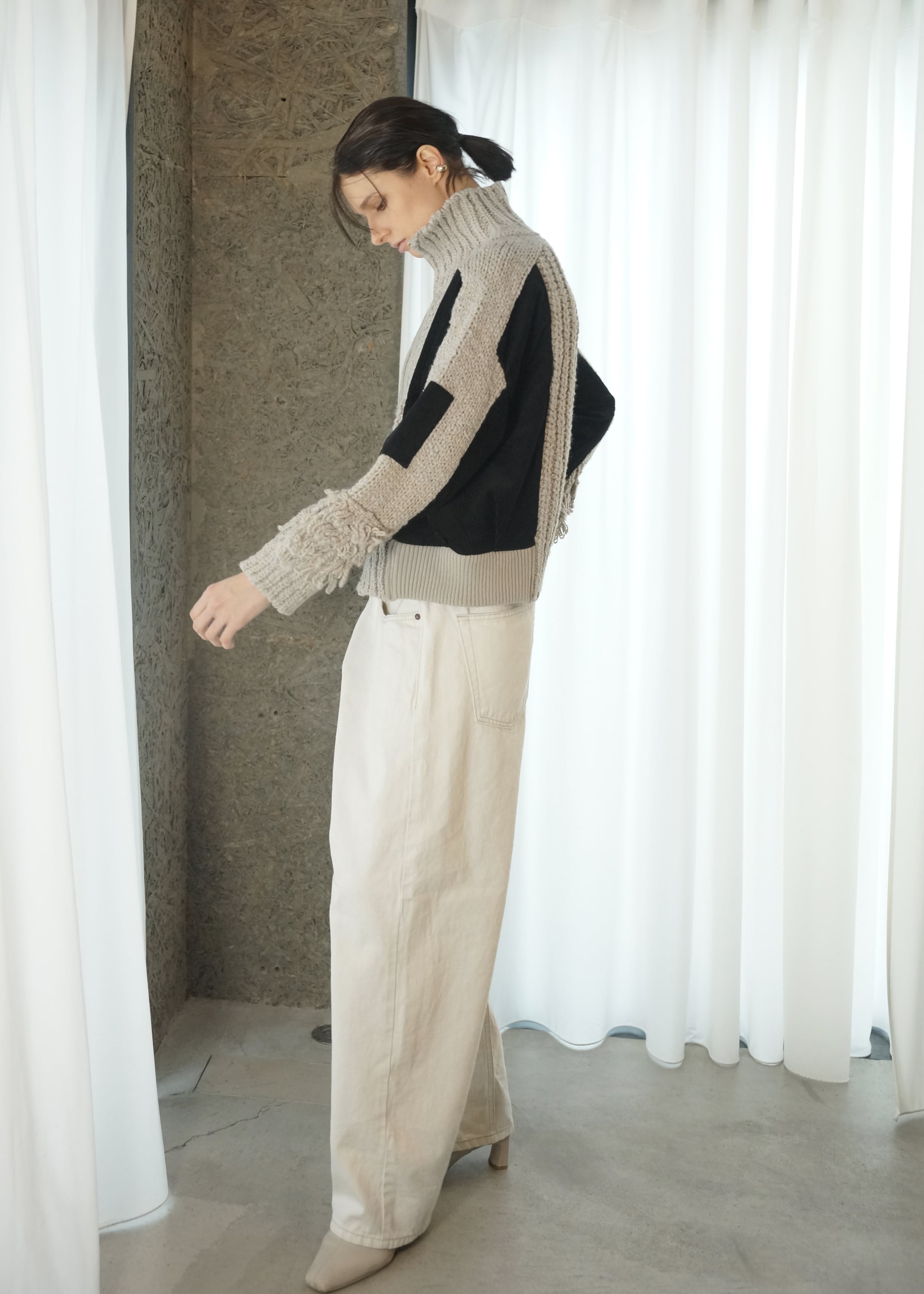 ジャンボスラブヤーンとバルキーウールを引きそろえ、機械で編める最大ゲージを駆使して編み上げたニット地。手編みのような立体感と温もりを持ちながら、機械編みならではの均整の取れた美しさを併せ持つ、希少性の高い素材。
