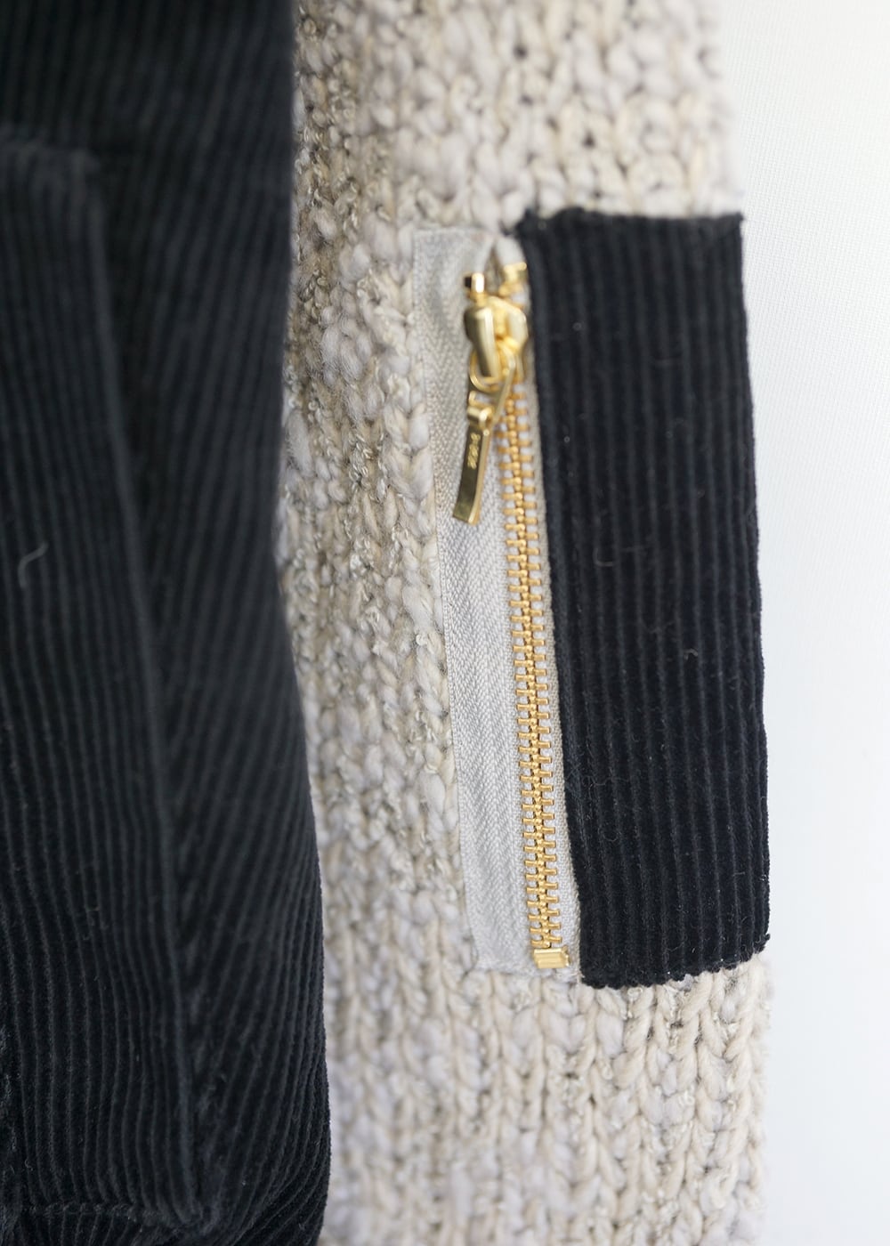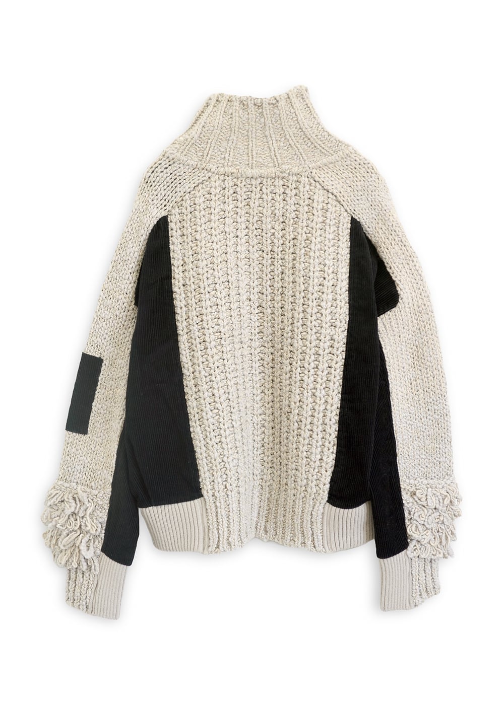 ジャンボスラブヤーンとバルキーウールを引きそろえ、手編みのような立体感あるニットと、畝の大きいコーデュロイを組み合わせた異素材切り替えが洒落感を演出。