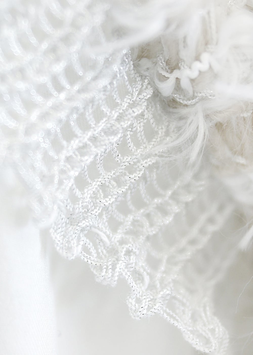 裾と袖口にはレーシーな透け感を残し、ラメコイルヤーンでさりげないアクセントを。ヴィンテージライクな光沢とほんのりした煌めきが、華やかなニュアンスを添える。