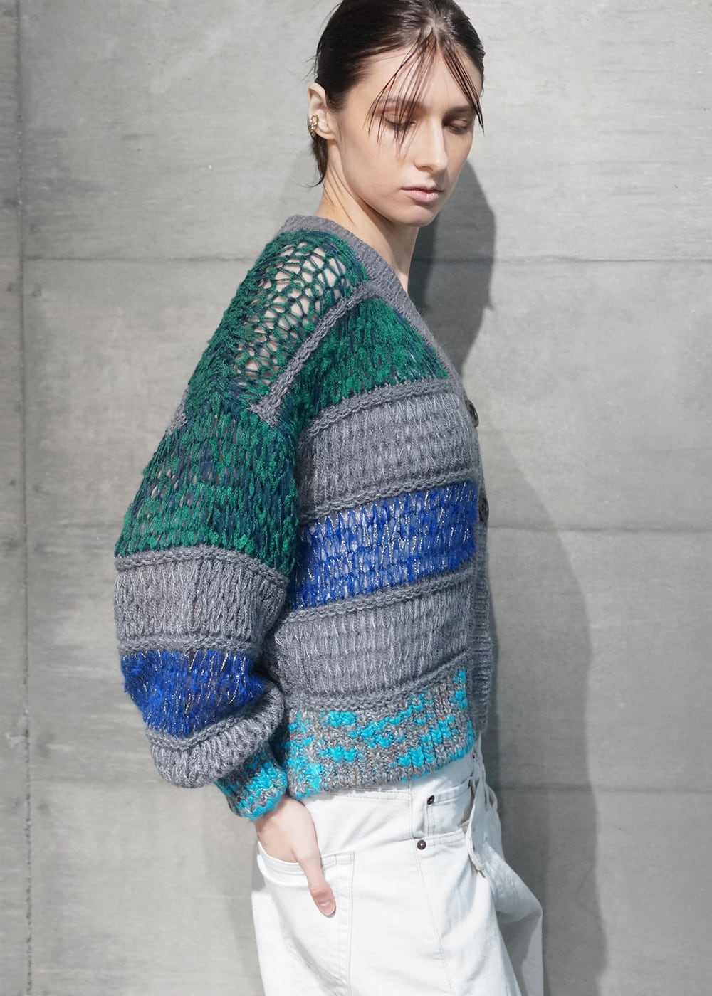 異なる質感の糸を丁寧に引きそろえた編地は、立体感とリズムを生み、一枚で着こなしに深みと個性を添えてくれます。