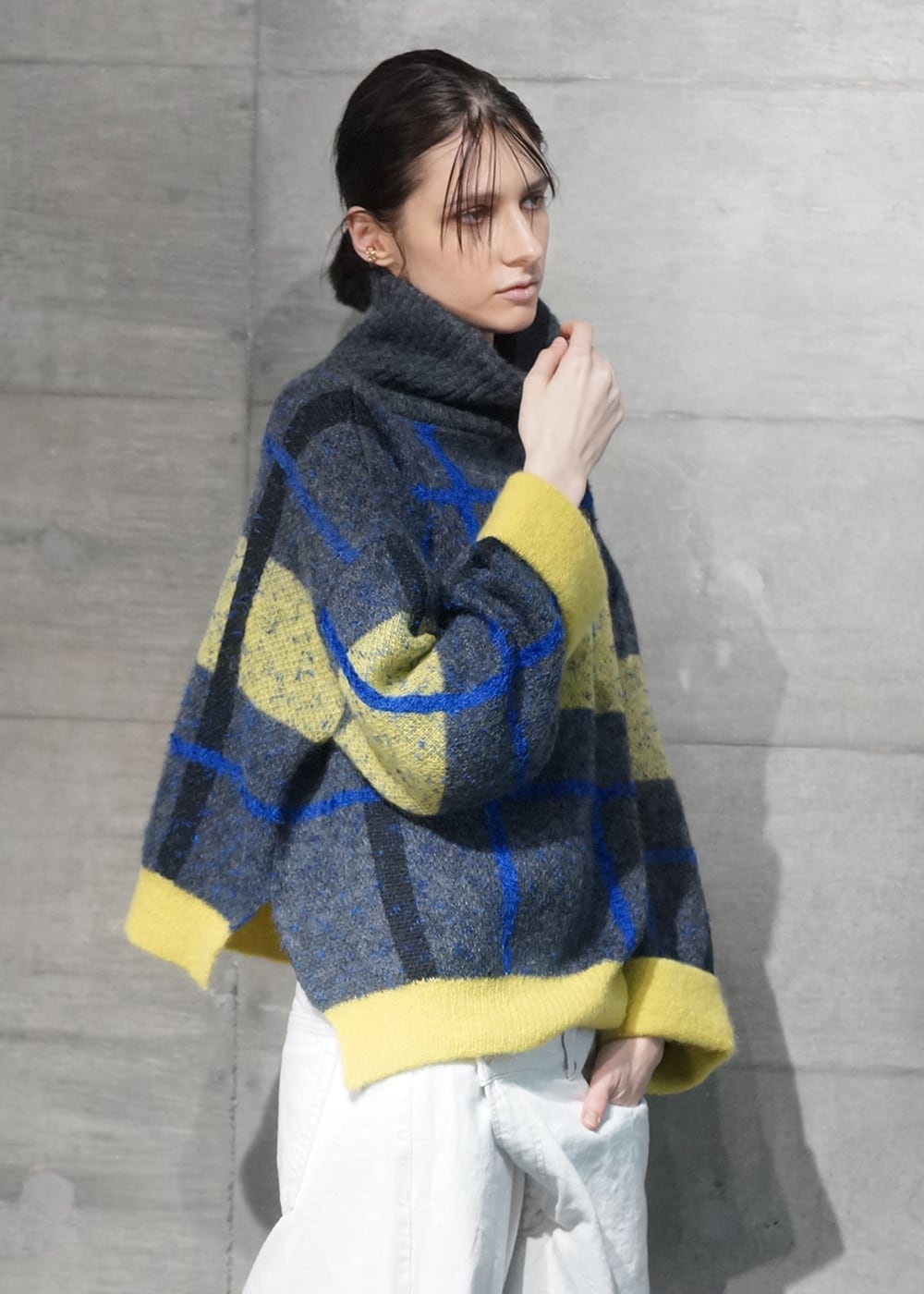 スーパーキッドモヘヤのなめらかな質感に、ジャガードで編み込まれた蛍光シャギーヤーンが埋もれながら顔を覗かせる独自のチェックテキスタイル。