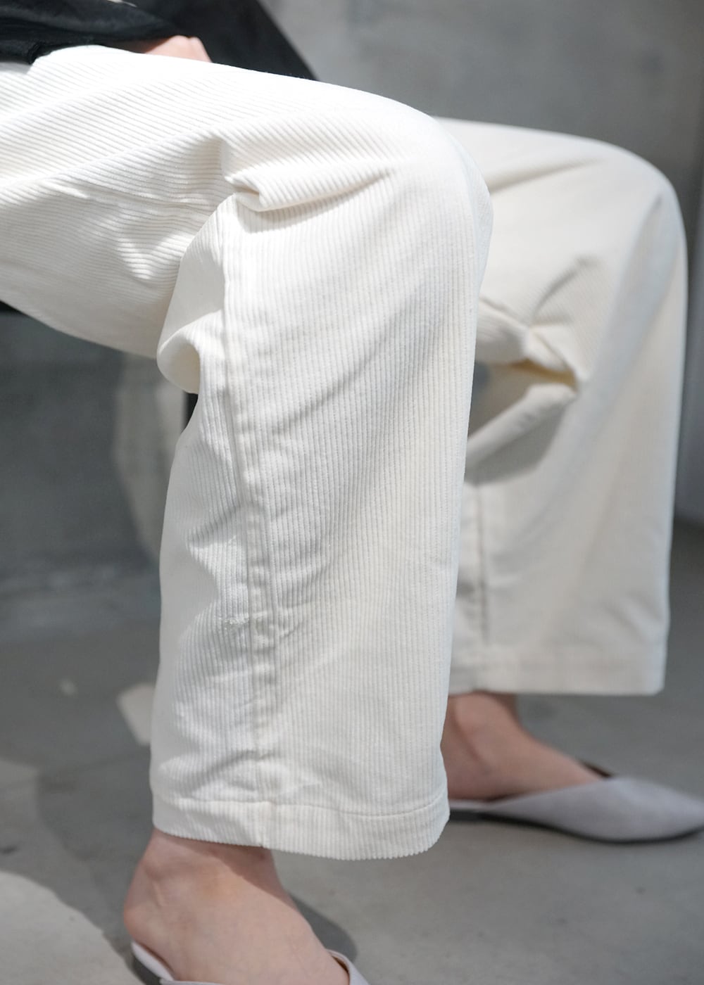 パンツのウエスト部はドローストリング仕様なので、ローウエストで抜け感を演出したり、ジャストウエストで上品にまとめたりと、その日の気分でシルエットを自在にコントロールできます。