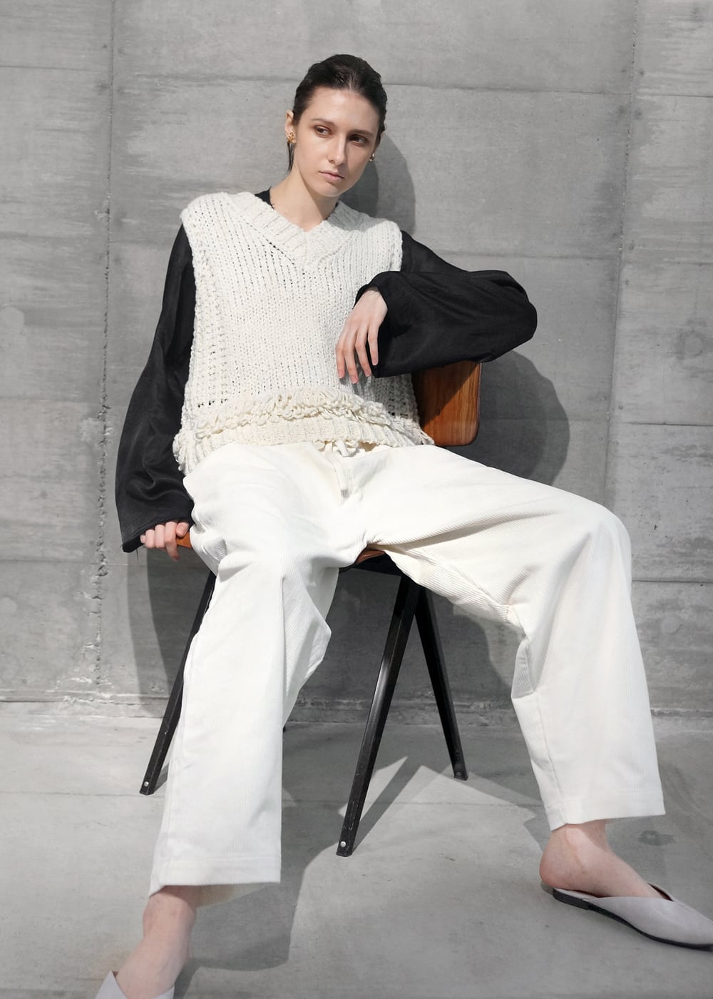 ジャンボスラブヤーンとバルキーウールを引きそろえ、手編みのような立体感あるニットべストと畝の大きいコーデュロイパンツとを組み合わせた、唯一無二のデザイン。