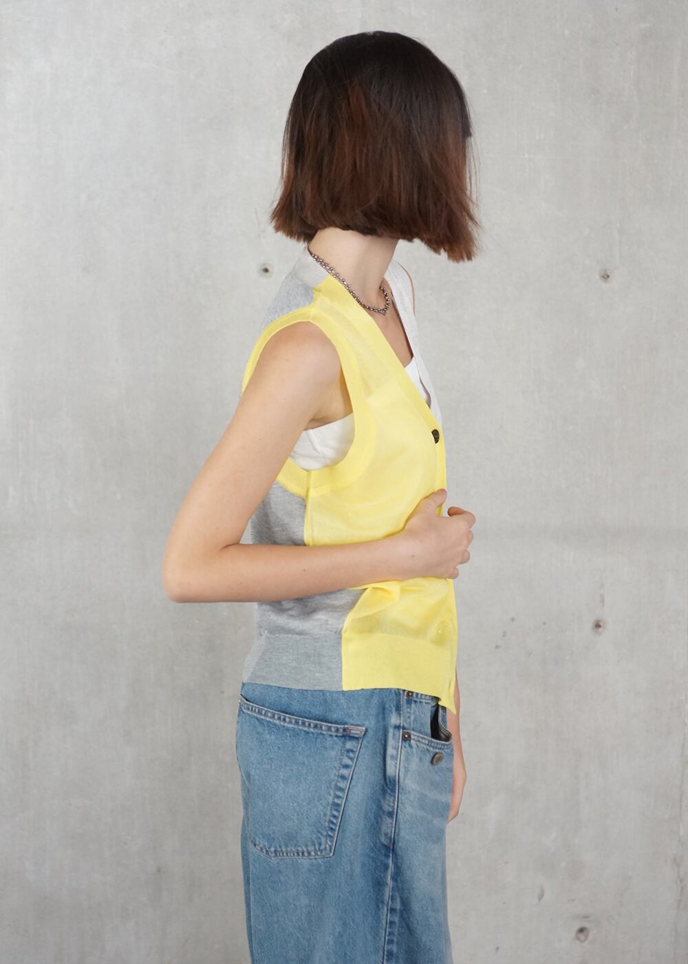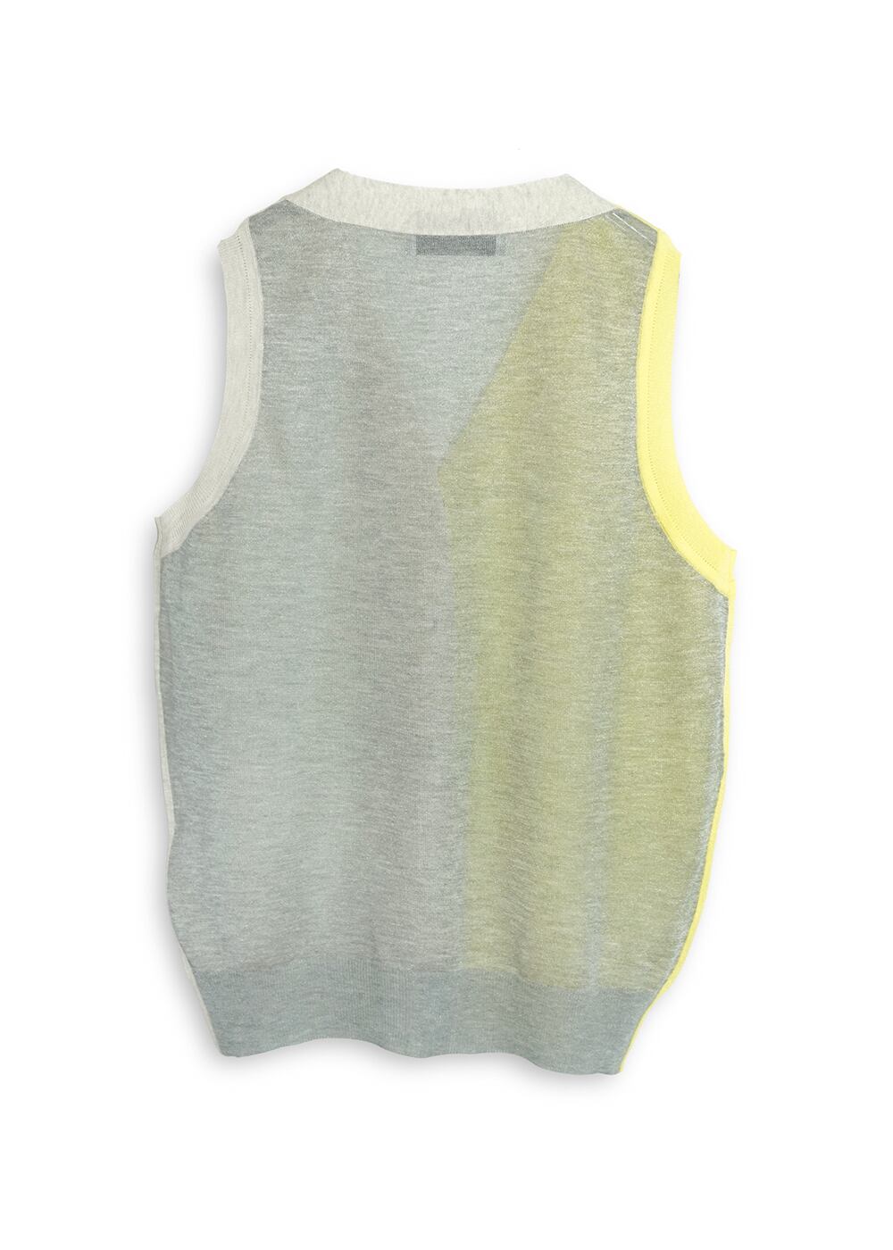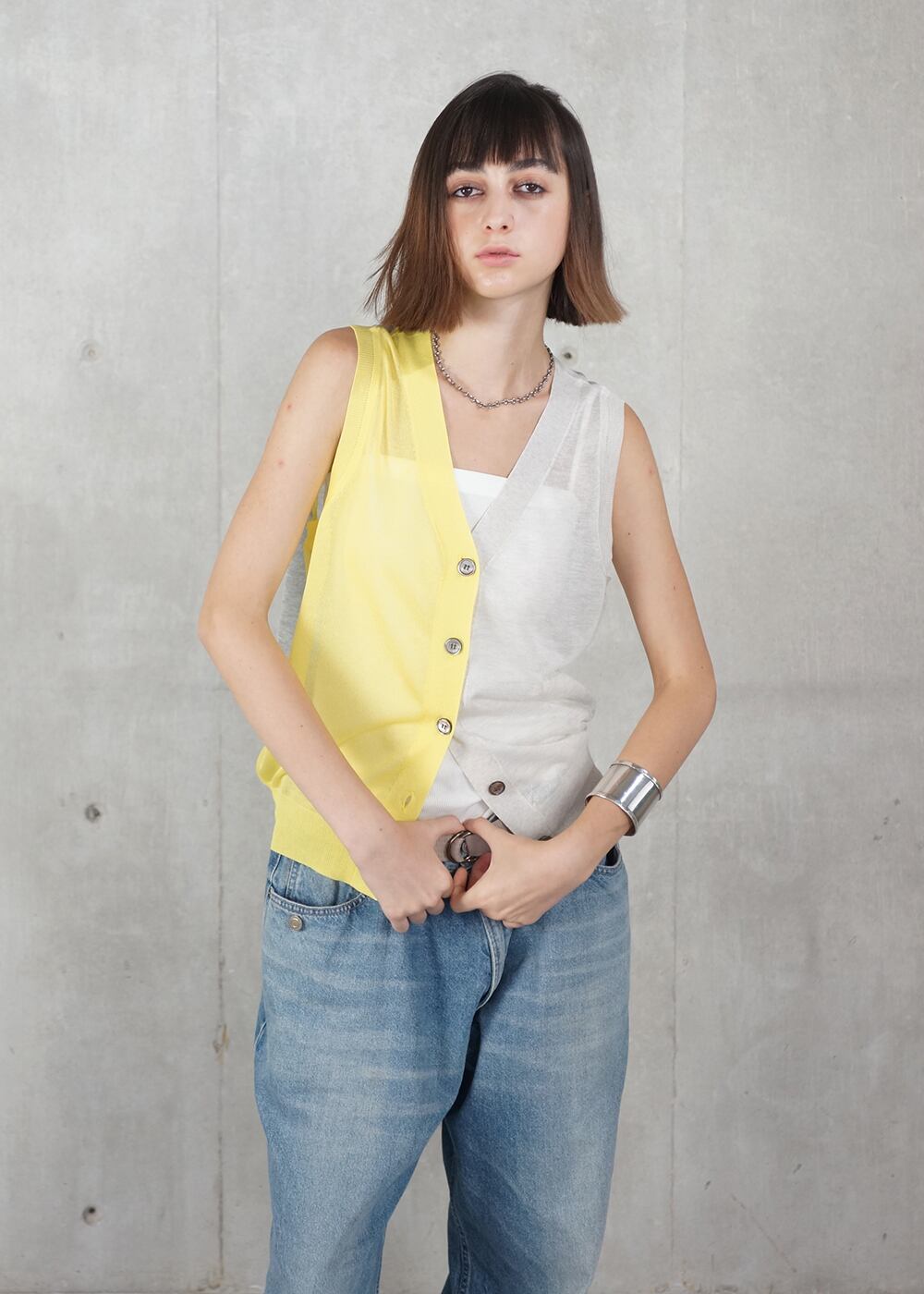 鮮やかなブライトカラーが装いに明るさを添え、バイカラーの配色がさりげない奥行きを演出するニットベスト。