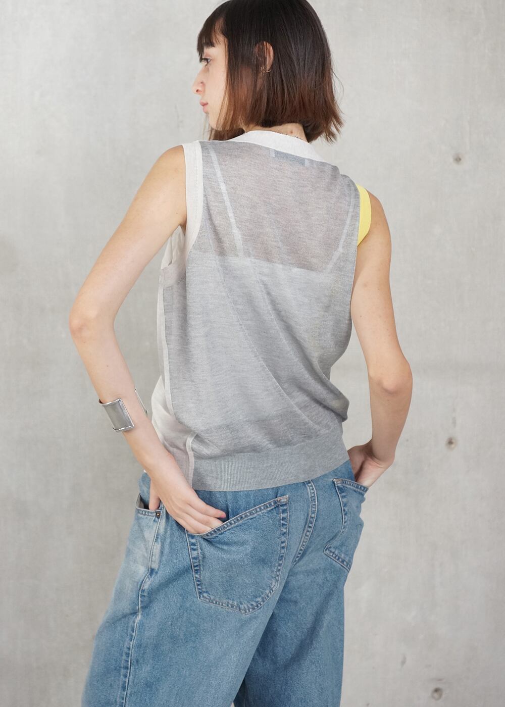 透け感のある薄手の編み地が、装いに抜けをつくり、軽やかで洗練された印象を与えます。