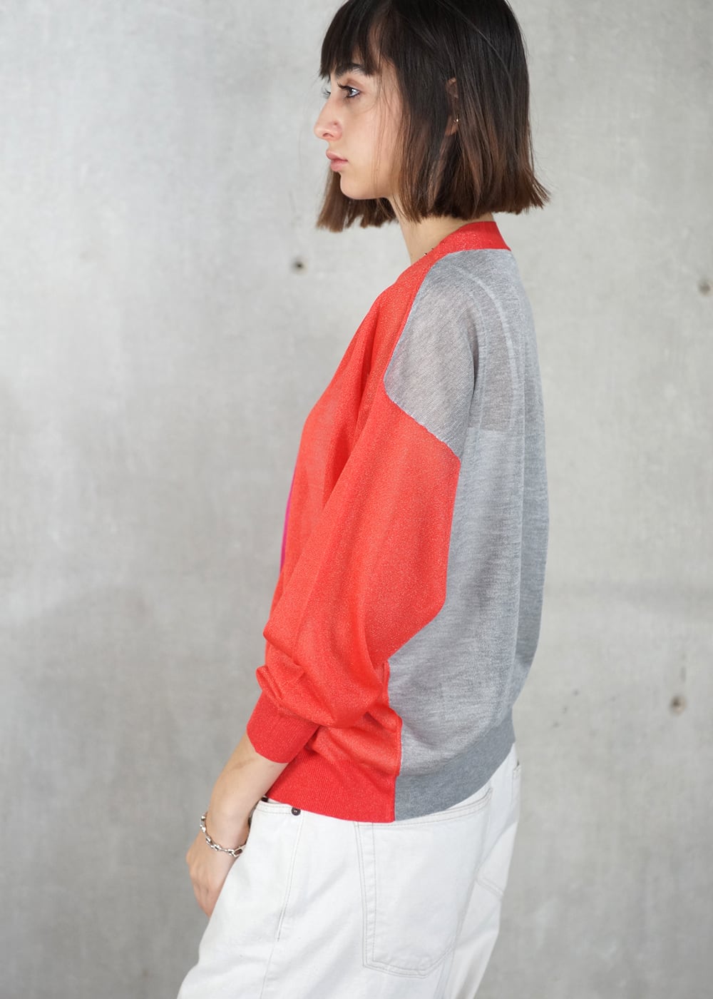 鮮やかなブライトカラーの着映え効果でポジティブな印象を作りながら、オーバーサイズのゆったりとしたシルエットと、バイカラーのデザインがこなれた雰囲気に導いてくれます。