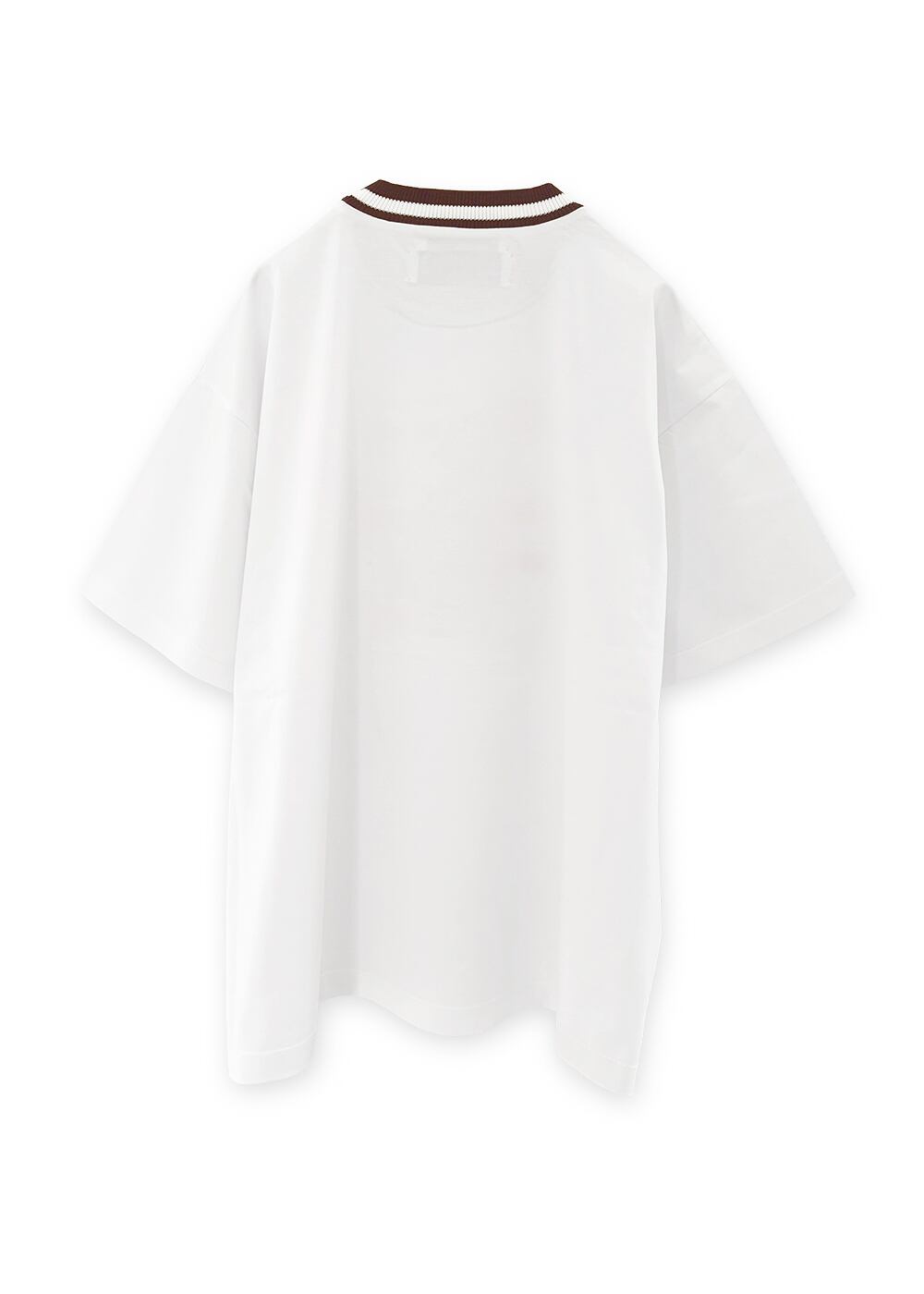 前面にアートプリントとコード刺繍を重ね、配色の衿はニットで編みたてられた、遊び心の詰まったTシャツ。