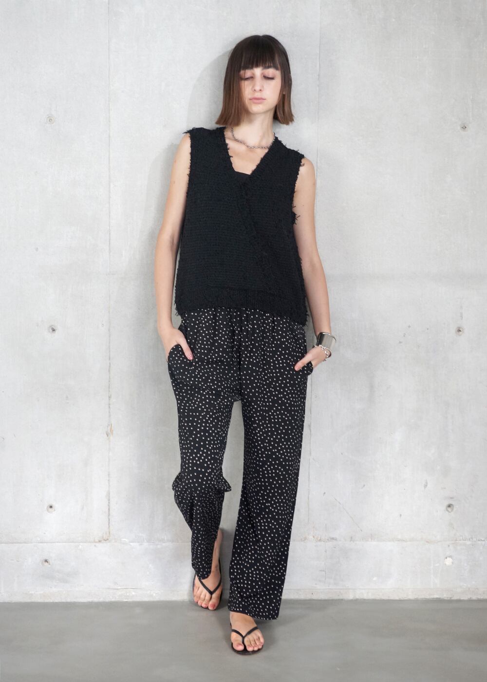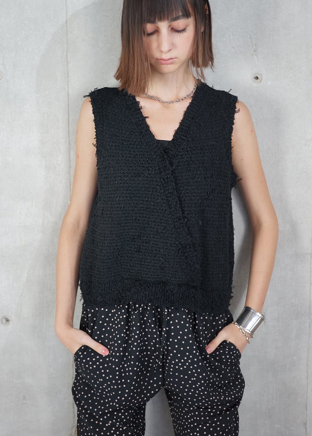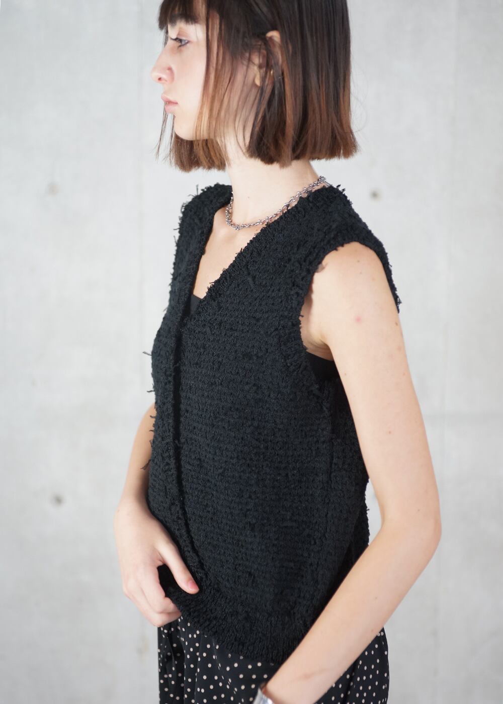 ・ニット部分は、〈表情豊かなスラブ糸〉と〈跳ねるようなチュールの羽糸〉を合わせ、ツィードのような奥行きを持たせた独自テキスタイル。