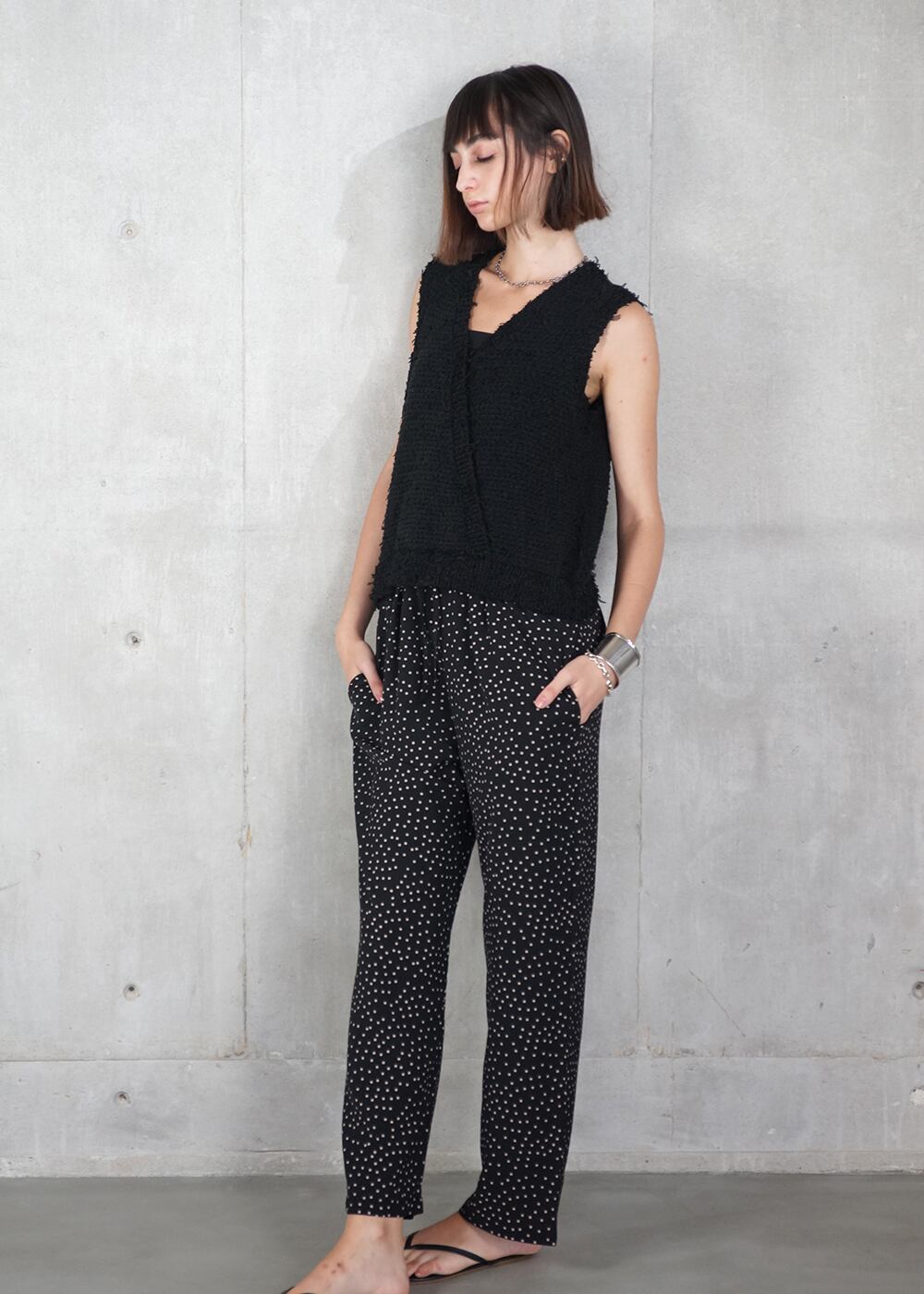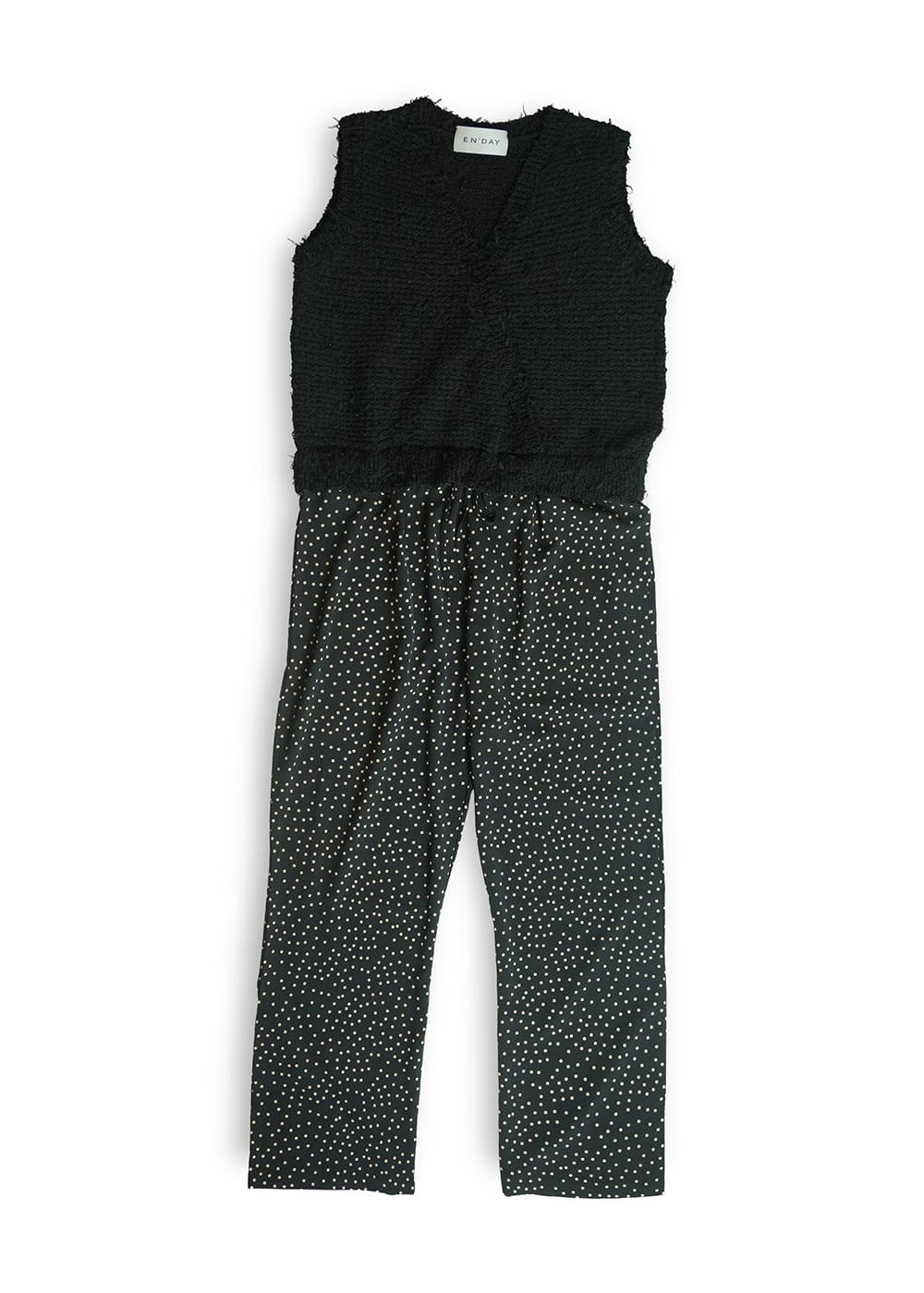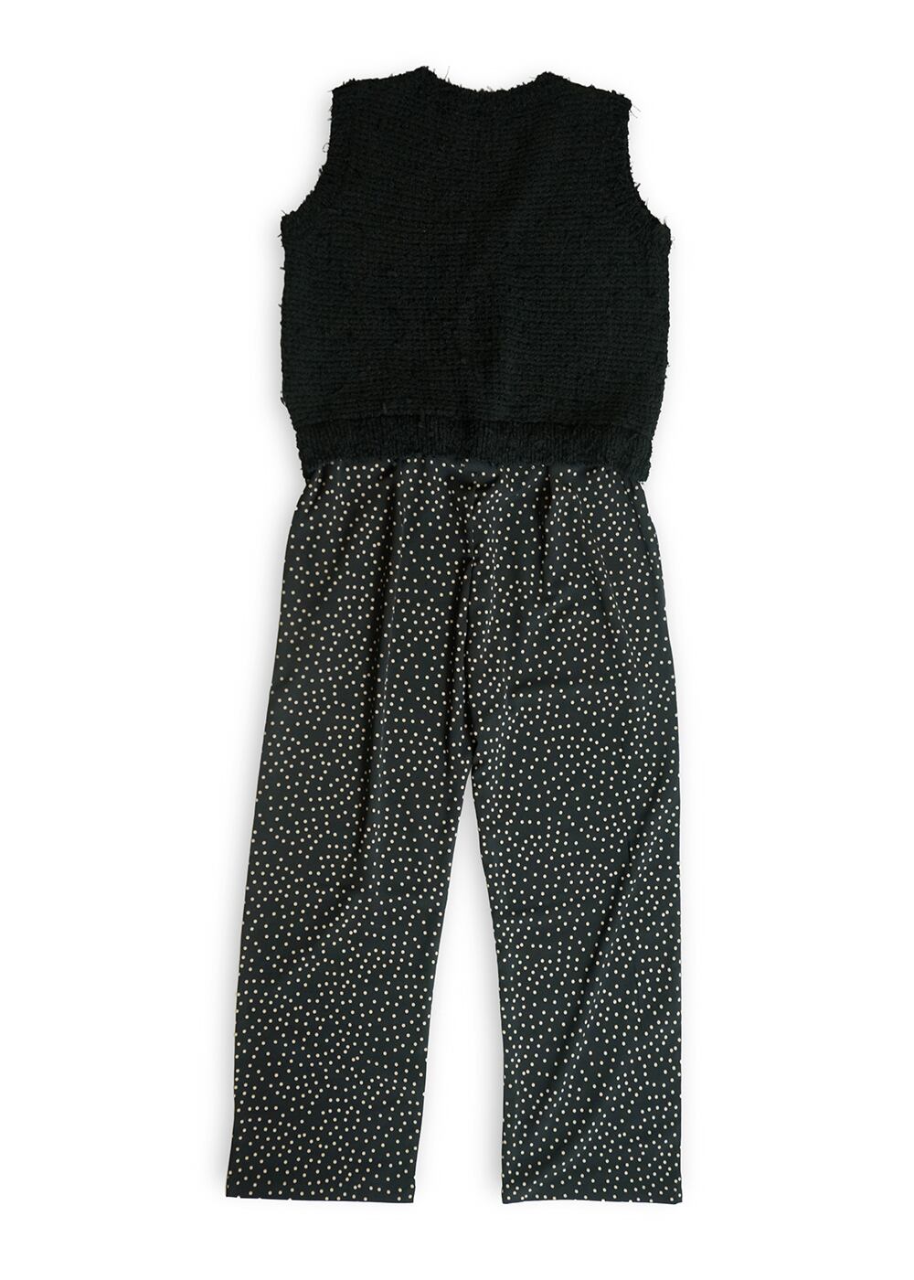 ニットのツィーディーな表情と、リラックス感のあるドローストリングパンツが一体になったオールインワン。