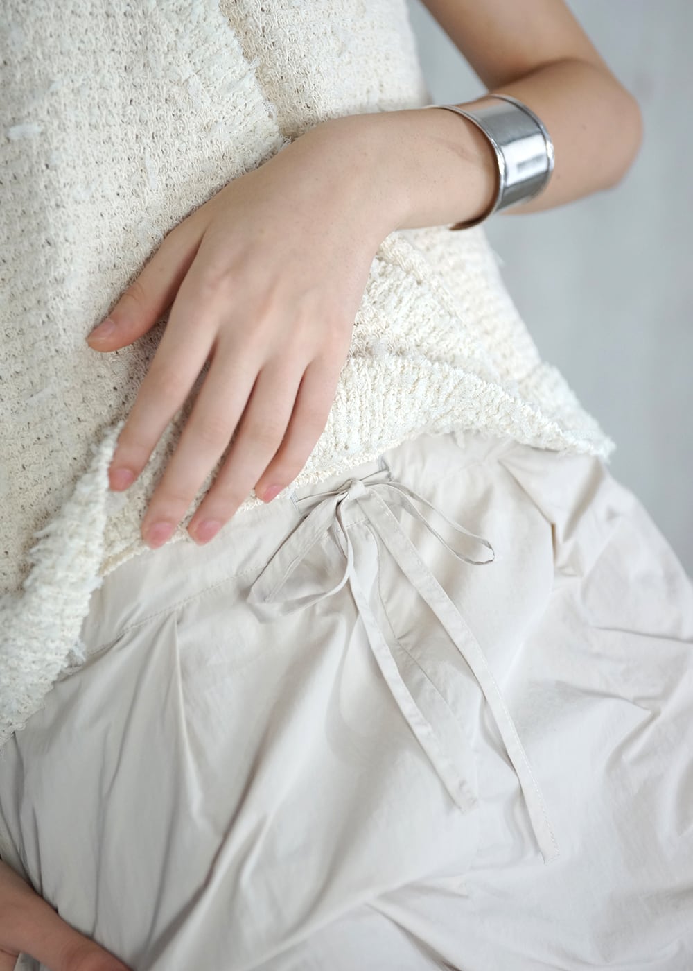 ウエスト紐で高さや締め具合を調整できるので、体型に合わせてシルエットを自在に整えられるのも〇。