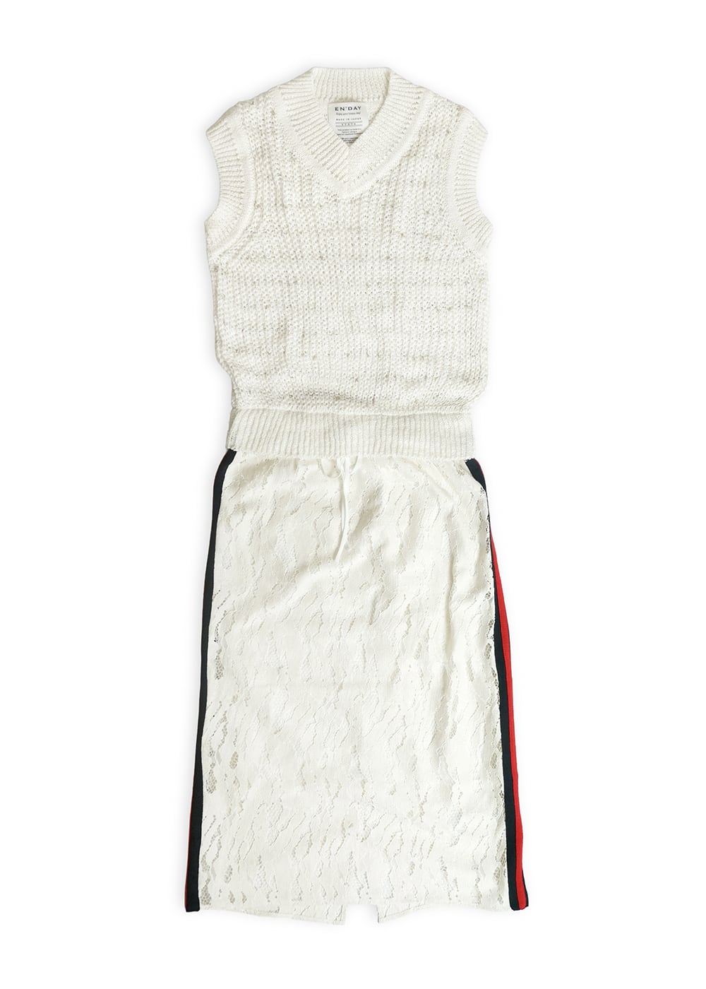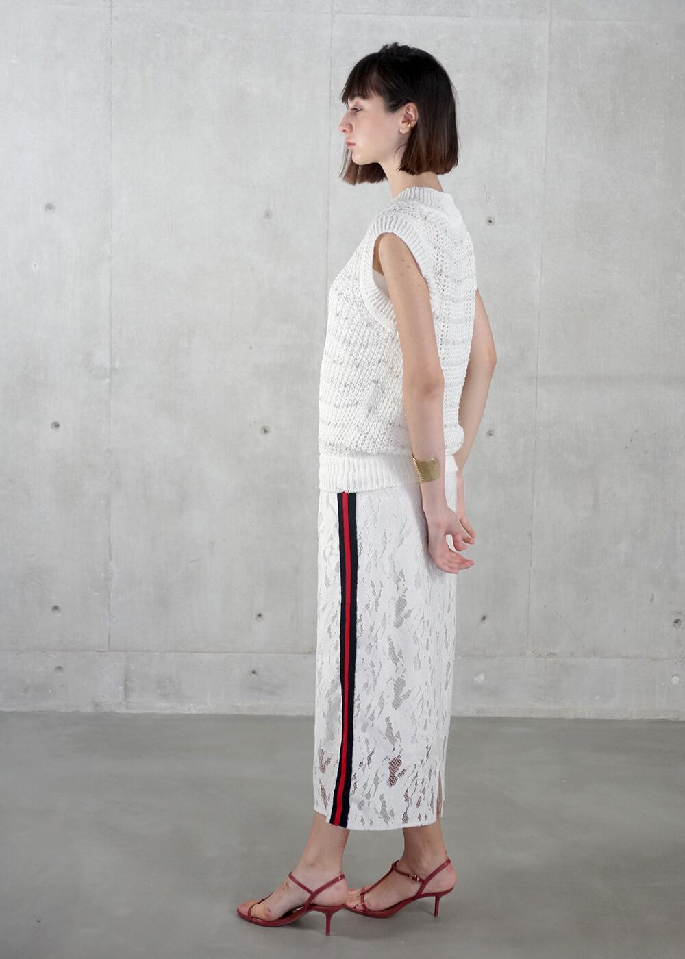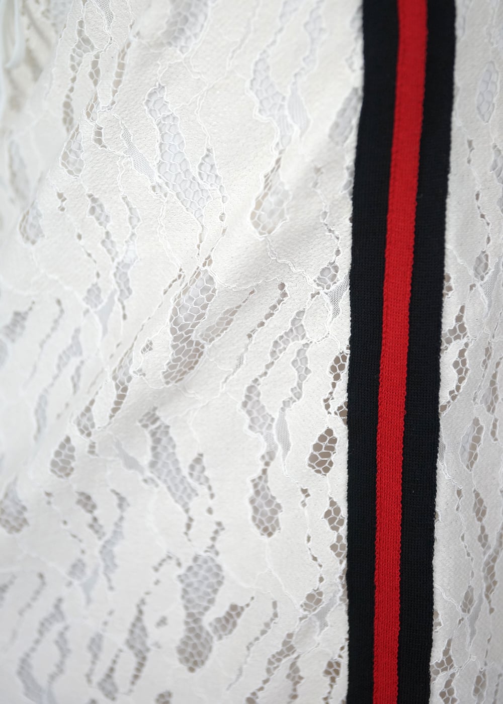 ニットの柔らかな表情に、抽象柄レースとスポーティーラインを重ね、異素材のメリハリで甘さを抑えた都会的な雰囲気に。