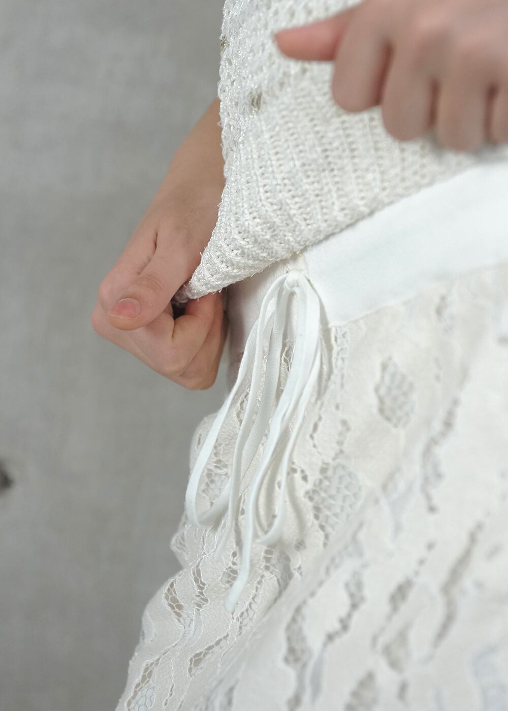 ・異素材ならではの質感差が、編み地とレースの表情を際立たせ、奥行きのある印象に。