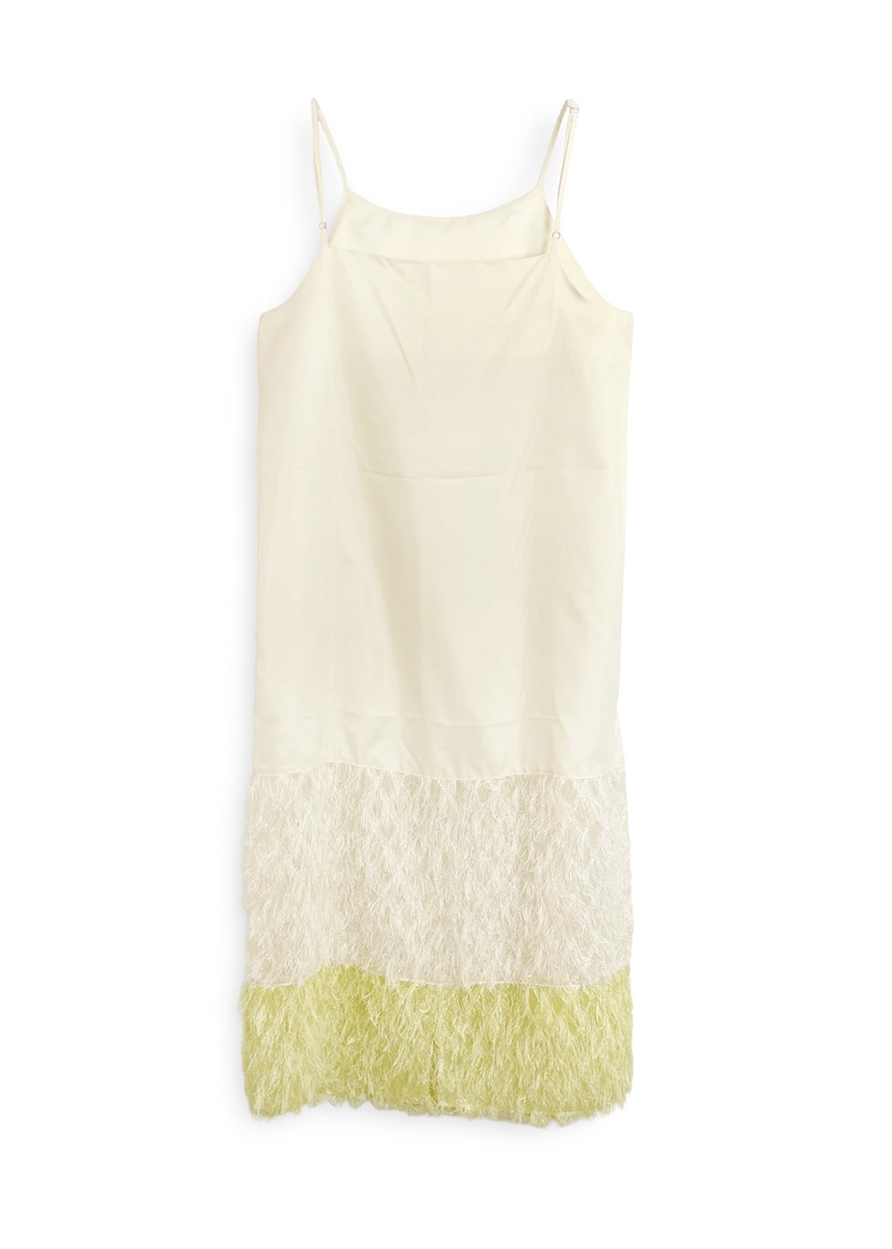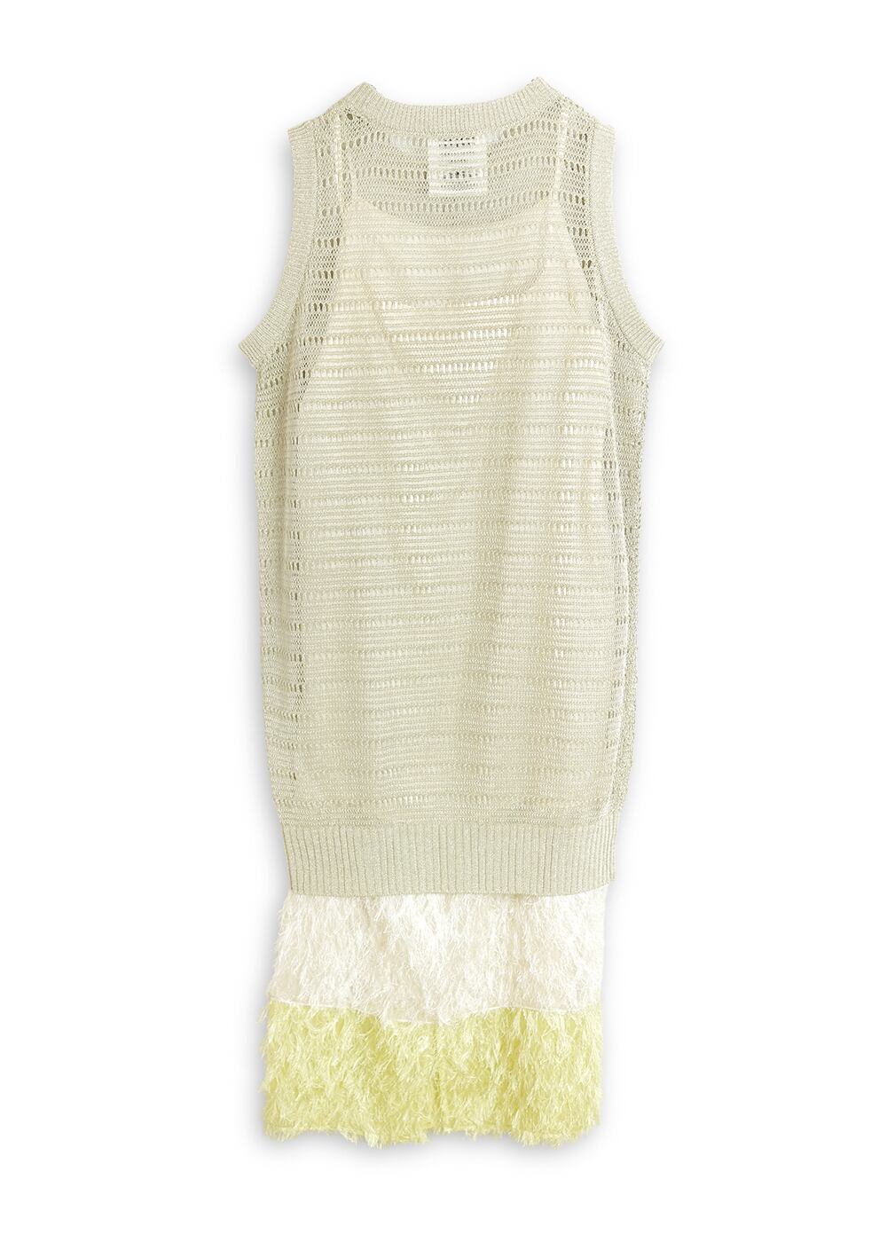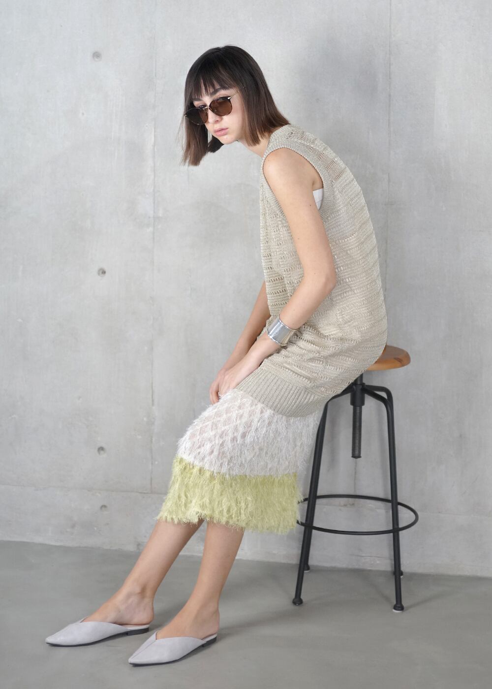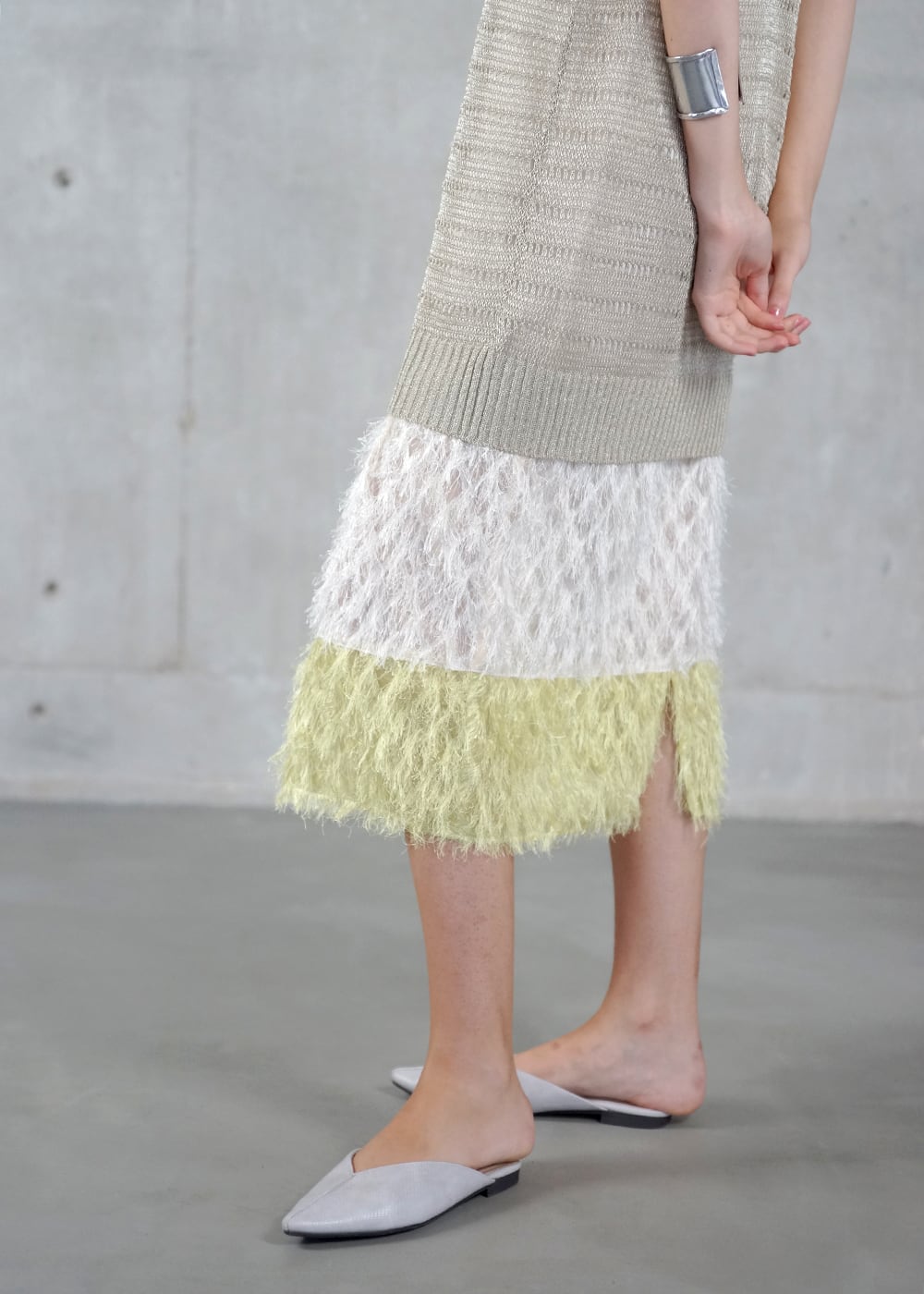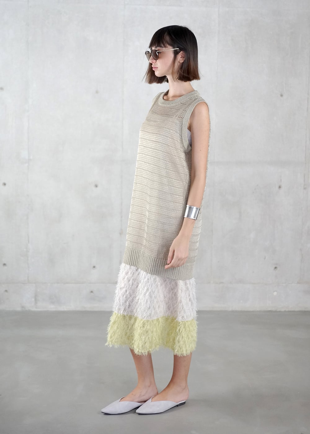 裾のカットジャガードは、キャミソールドレスにドッキングし、2色の奥行きをもたせることで裾に立体感とリズムを添える。