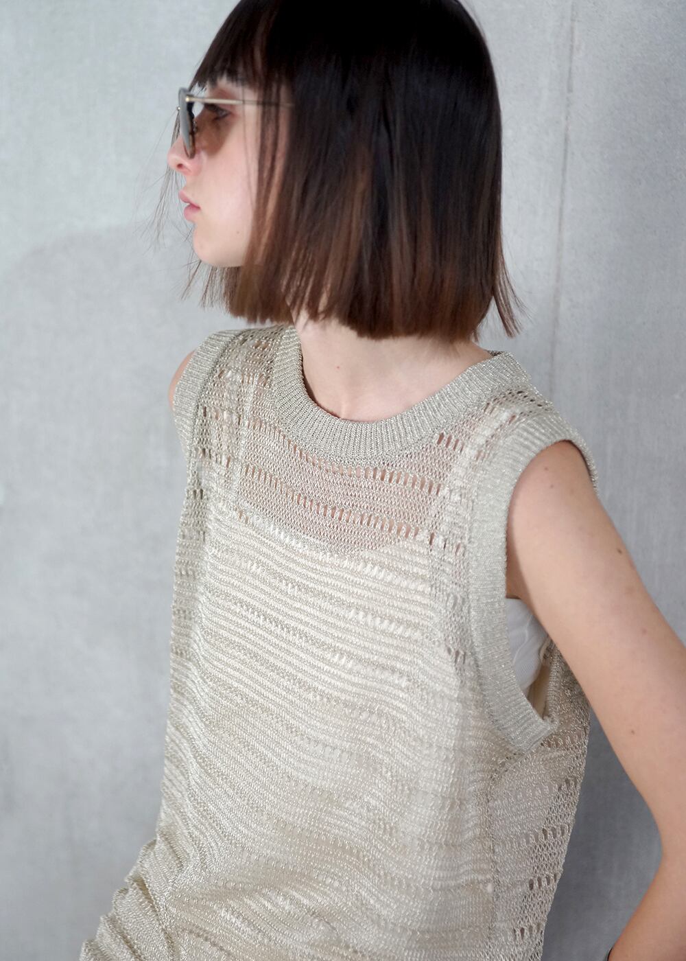 ヴィンテージのような艶をもつコイル状のラメ糸で編み立てた、透かし柄のテキスタイルがベース。