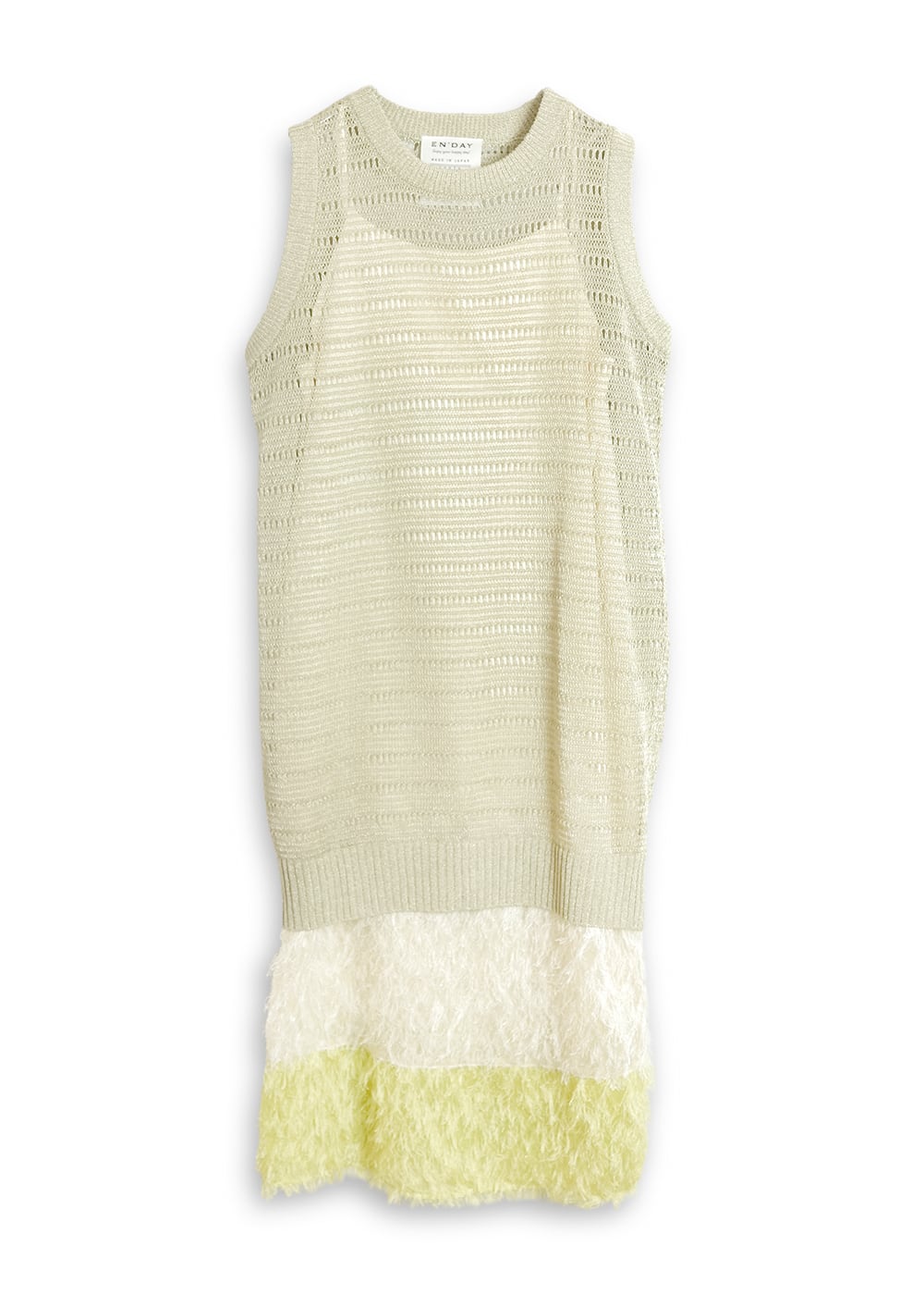 繊細な透かし柄のノースリニットの裾からのぞく、カットジャガードのカラーブロッキングが奥行きのあるレイヤードを描くワンピース。