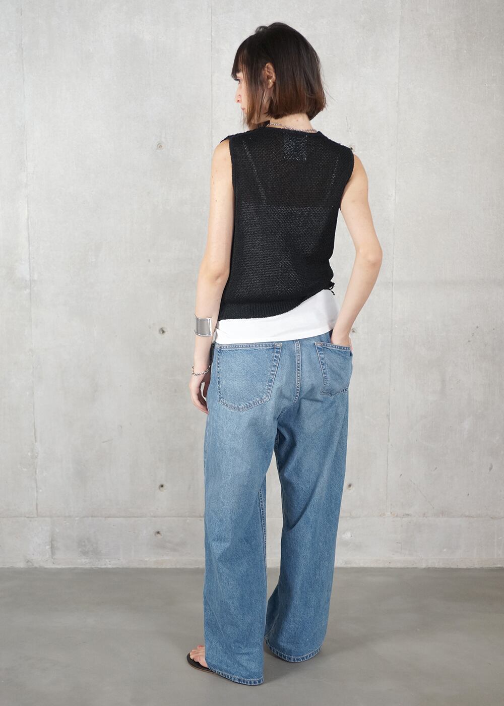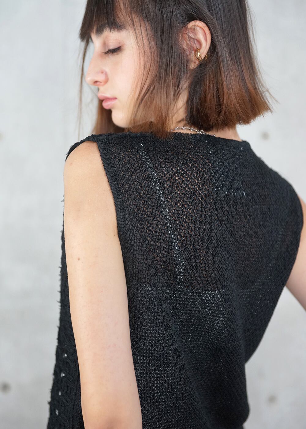 ・後ろ見頃は、ラスティックでマットな風合いの和紙の糸をメインに、さらりとした肌触りのメッシュ編み。