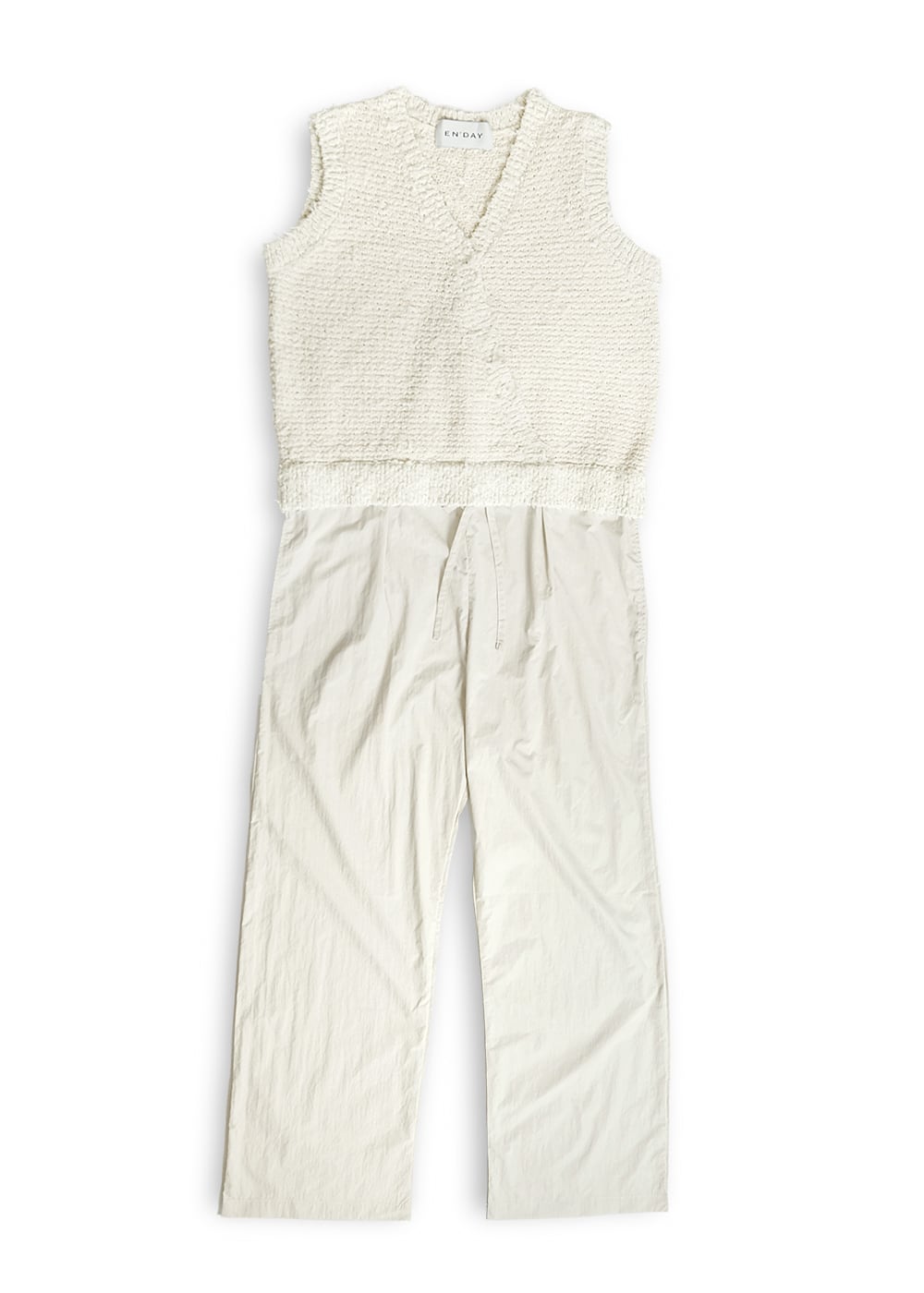 ニットのツィーディーな表情と、リラックス感のあるドローストリングパンツが一体になったオールインワン。
