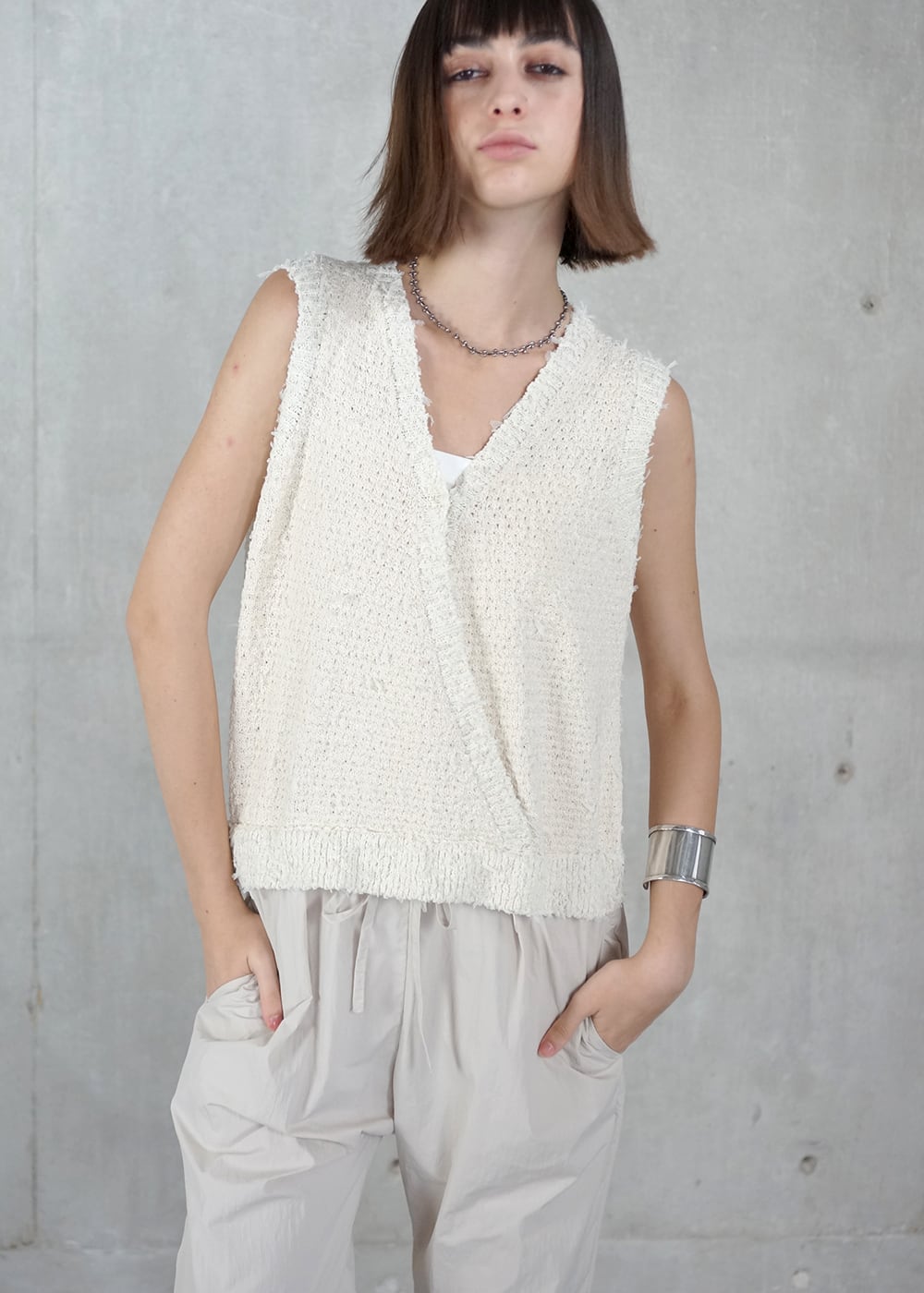 ・ニット部分は、〈表情豊かなスラブ糸〉と〈跳ねるようなチュールの羽糸〉を合わせ、ツィードのような奥行きを持たせた独自テキスタイル。