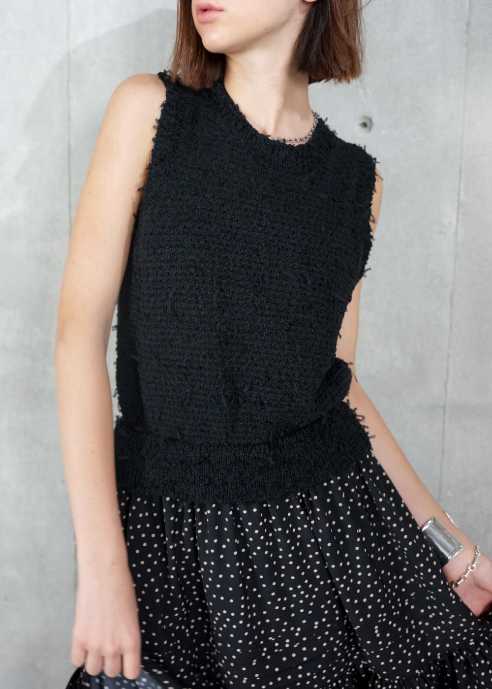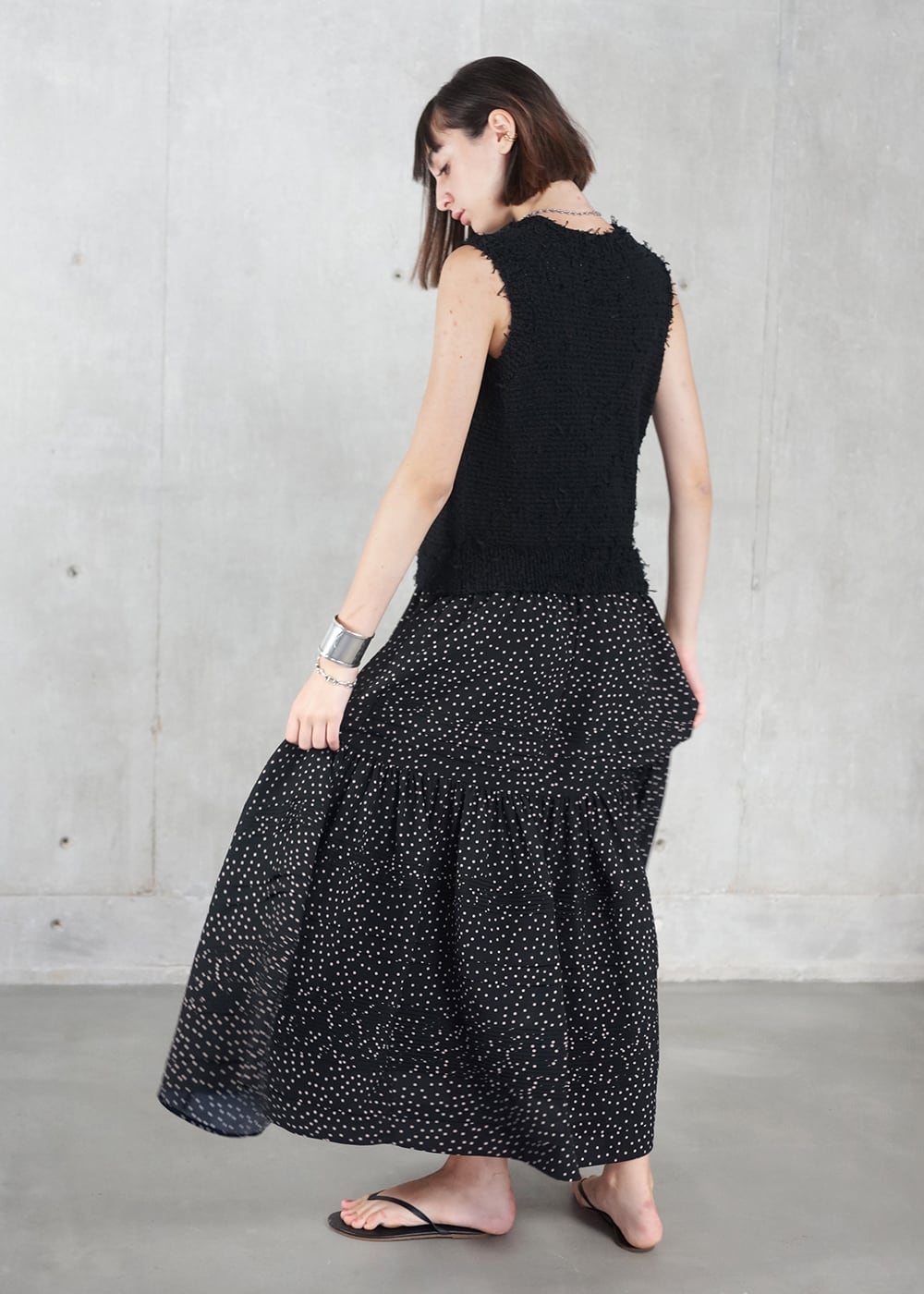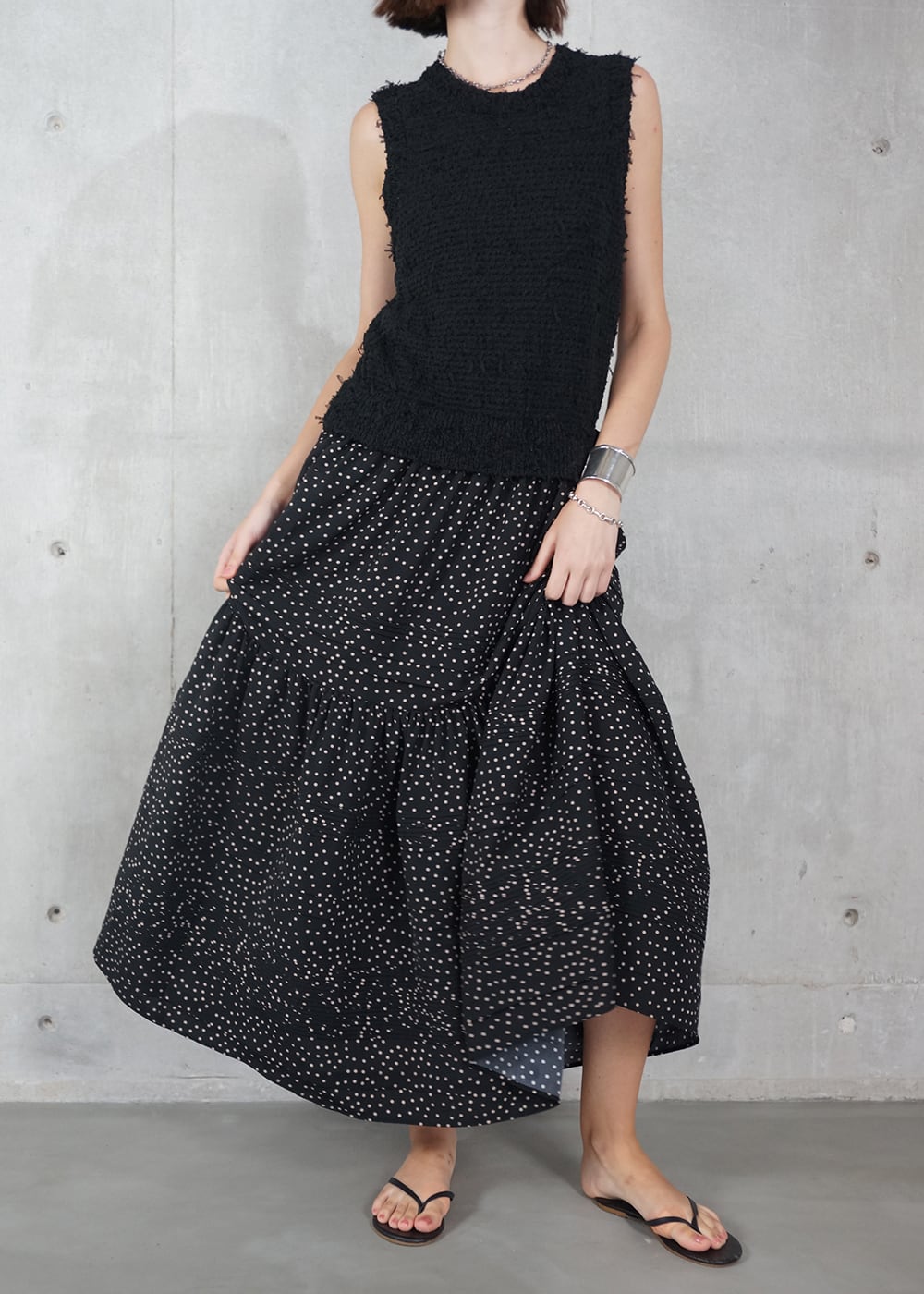 ニットのツィーディーな表情と、細かなピンタックを効かせたティアードスカートがドッキングされ、一枚でサマ見え。