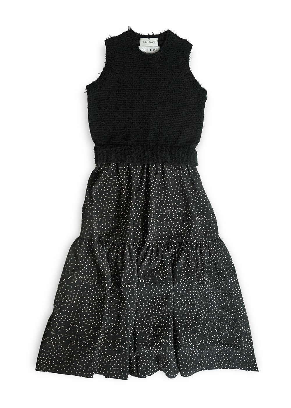 ・RELEVÉとのコラボレーションにより、ニットとスカートの質感を引き立て合い、印象的なワンピーススタイルを完成。