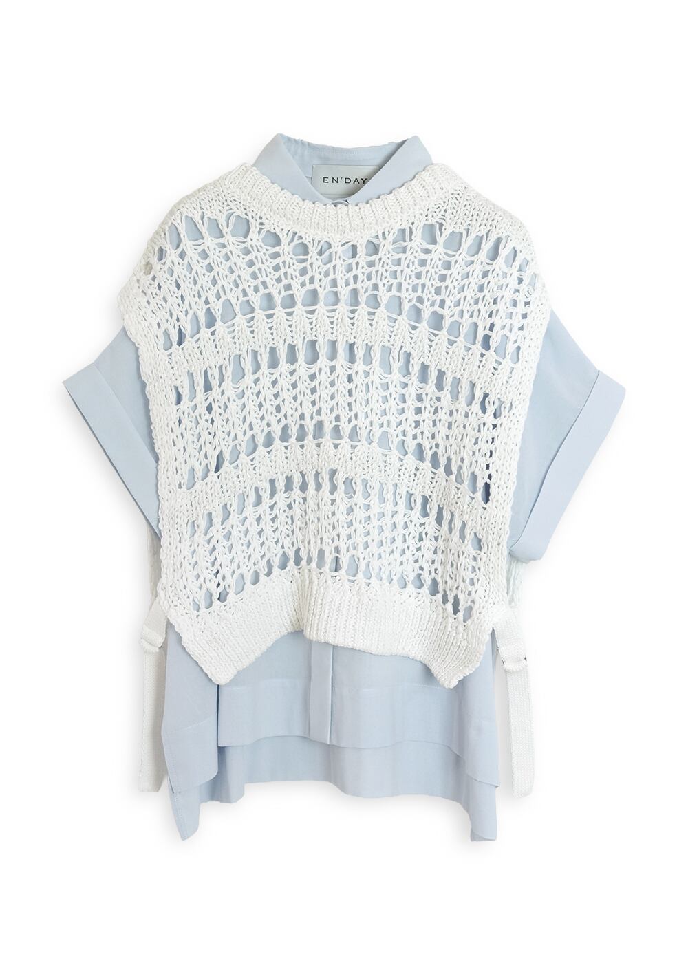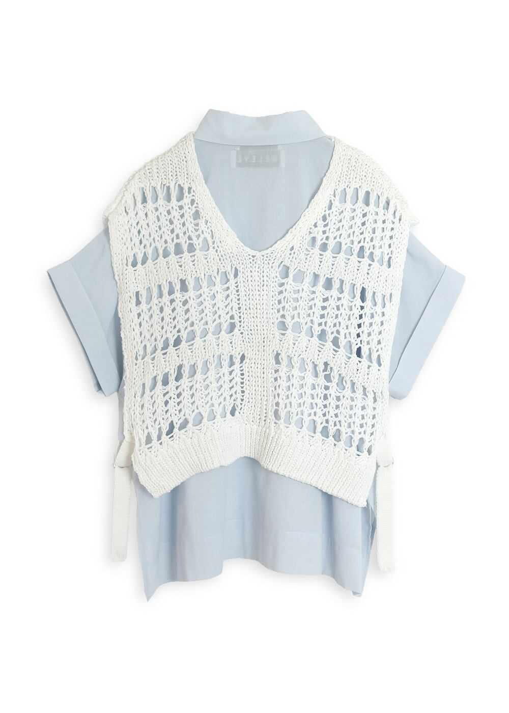 メッシュの透け感と涼やかな綿ボイルシャツのコントラストが、装いを新鮮にアップデート。