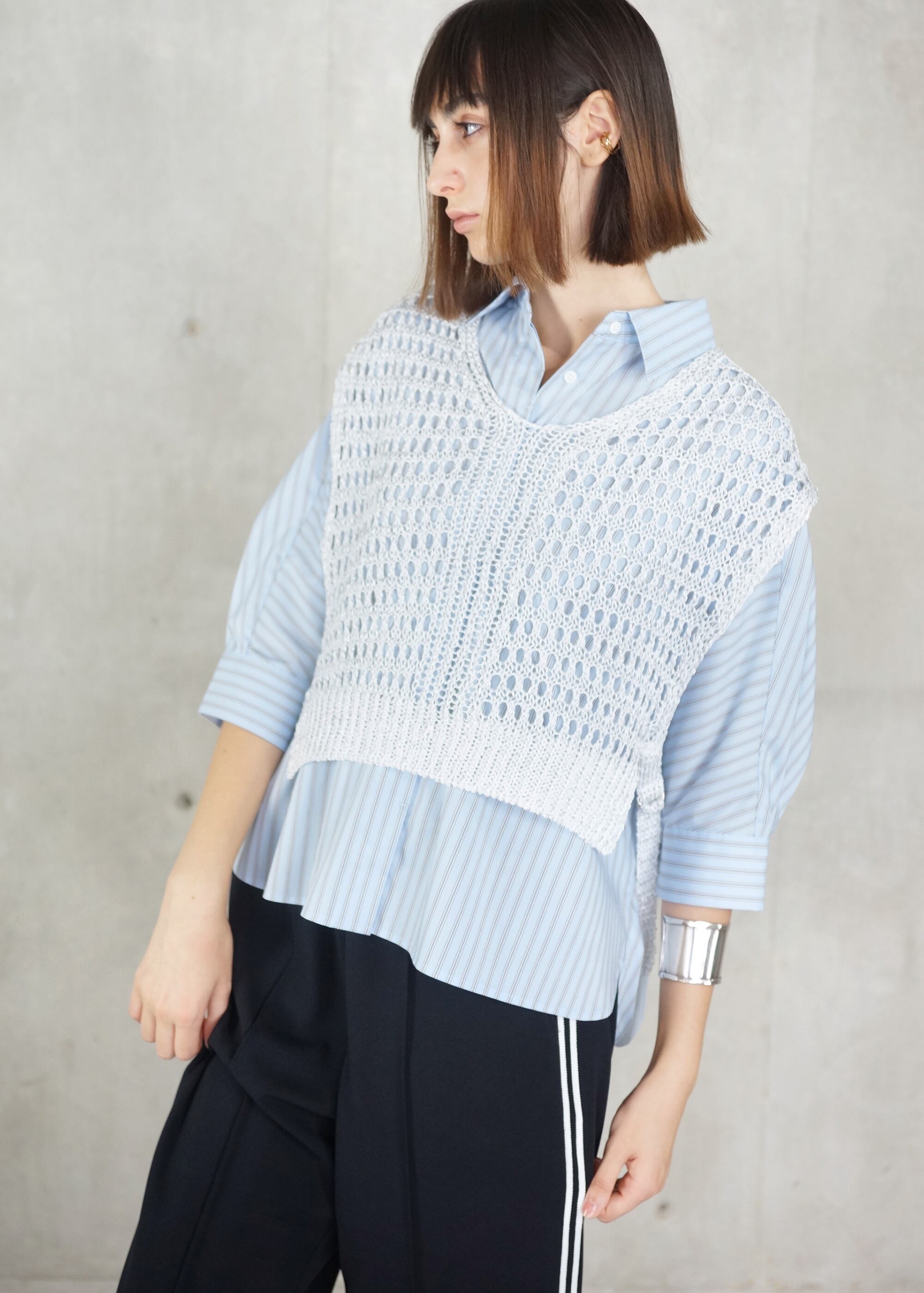 シャツ一枚でも様になる完成度に、ラメがきらりと光るメッシュ編みのニットベストを重ね、コーディネートに上級感をプラス。