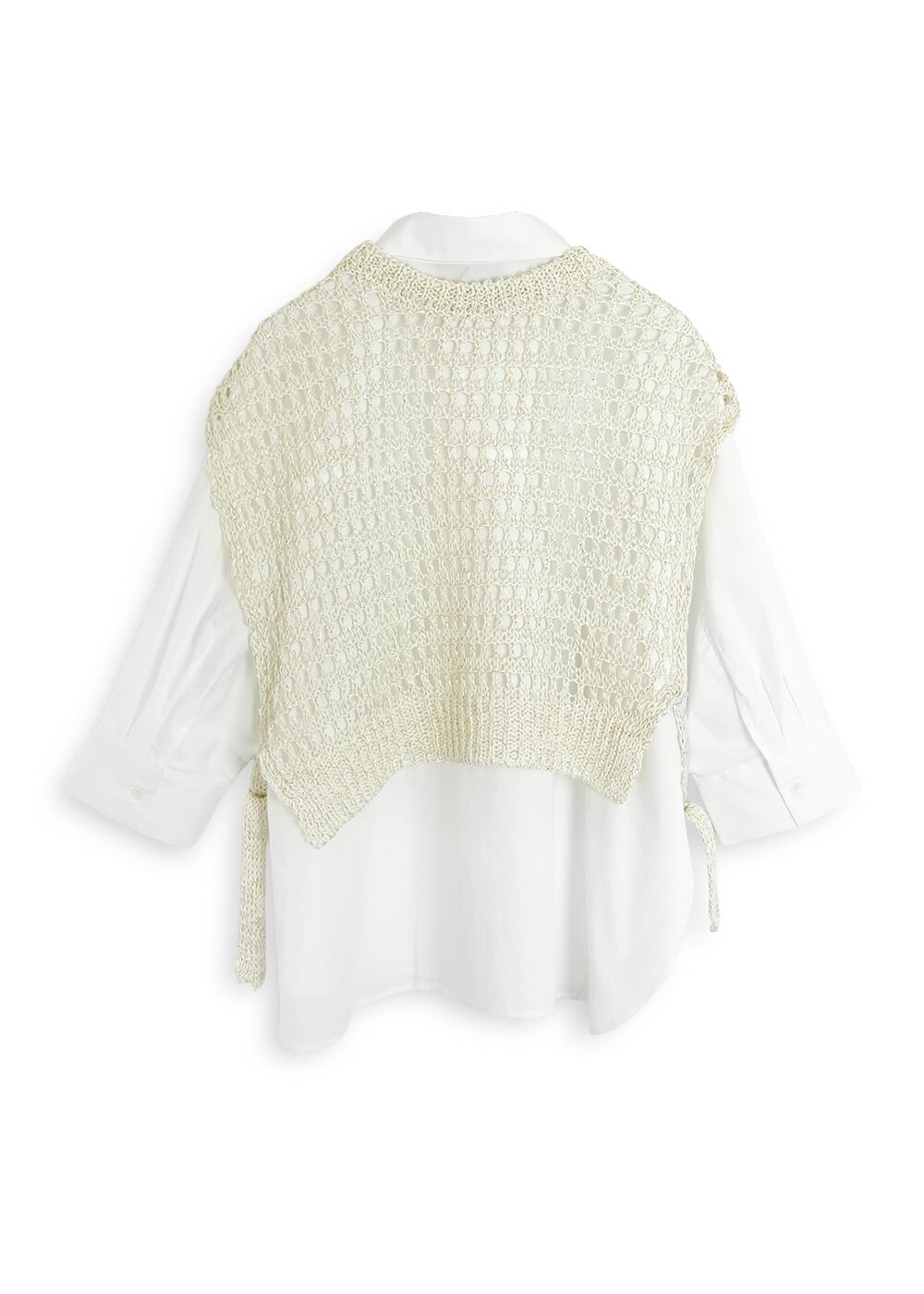 ・ベスト部分には、ギマ加工を施したシャリ感のある細番手コットン糸にラメのコイルを引きそろえた素材を使用。さらりとした肌離れの良いタッチとほどよい立体感で、煌めくラメが装いにアクセサリーのような華やぎを添える。