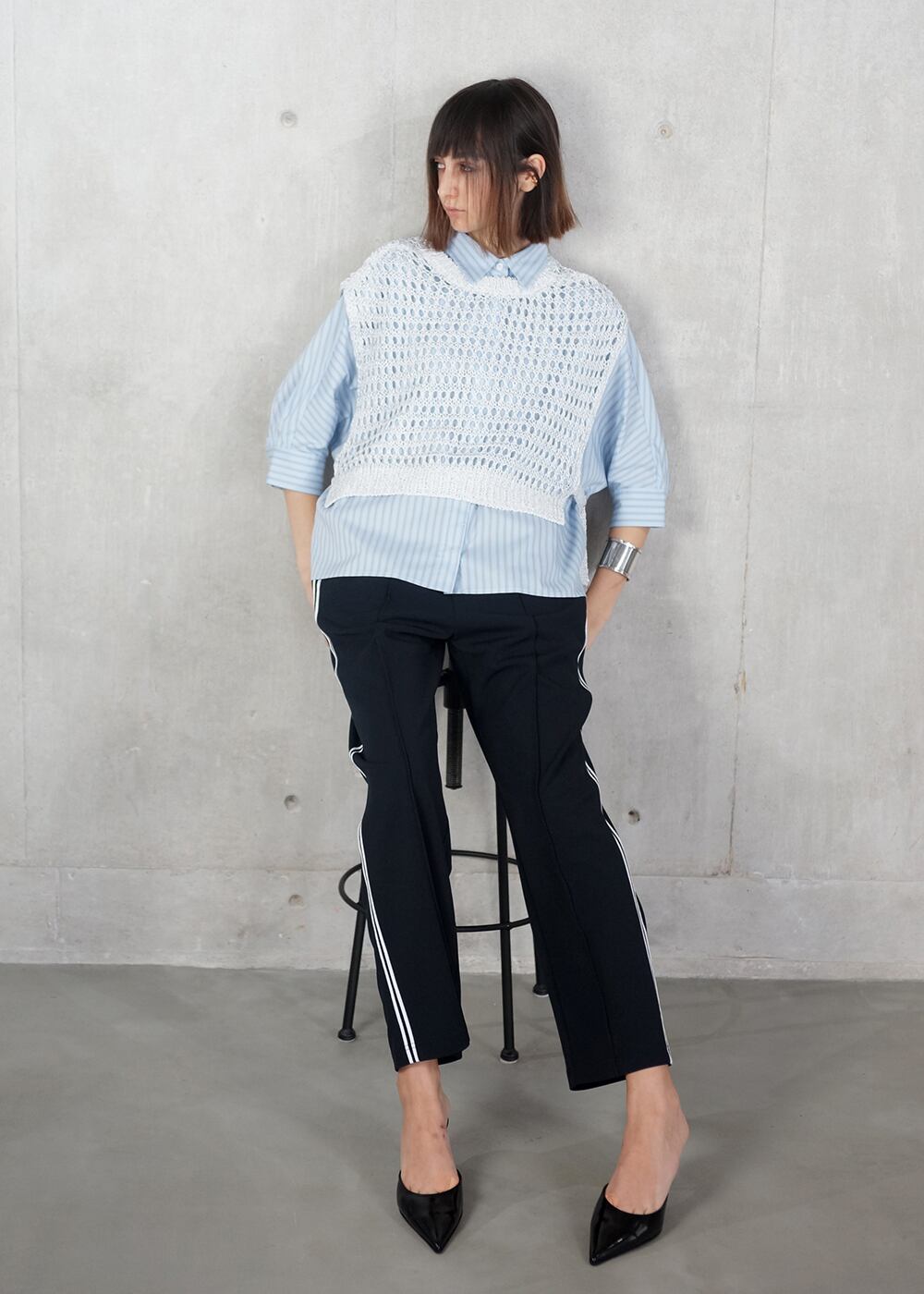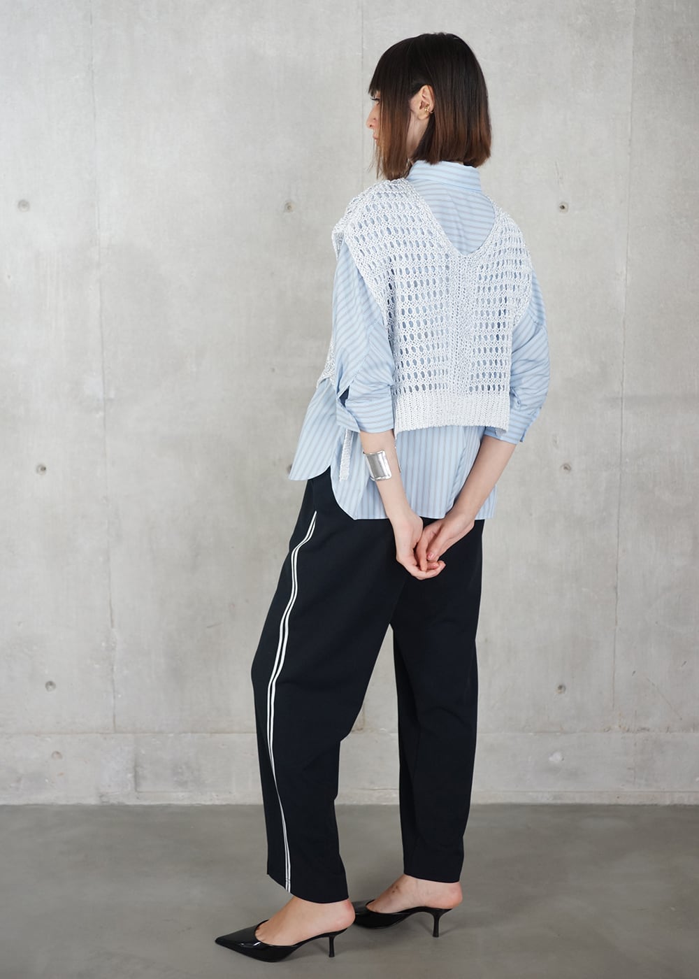 シャツ一枚でも様になる完成度に、ラメがきらりと光るメッシュ編みのニットベストを重ね、コーディネートに上級感をプラス。