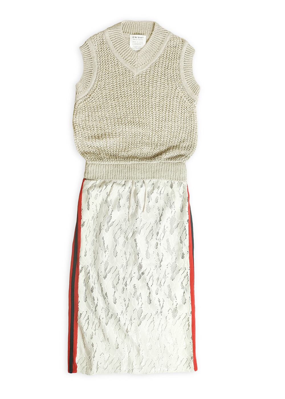ラスティックな表情のざっくりと編まれたニットに、抽象模様のレーススカートをドッキングした一着。