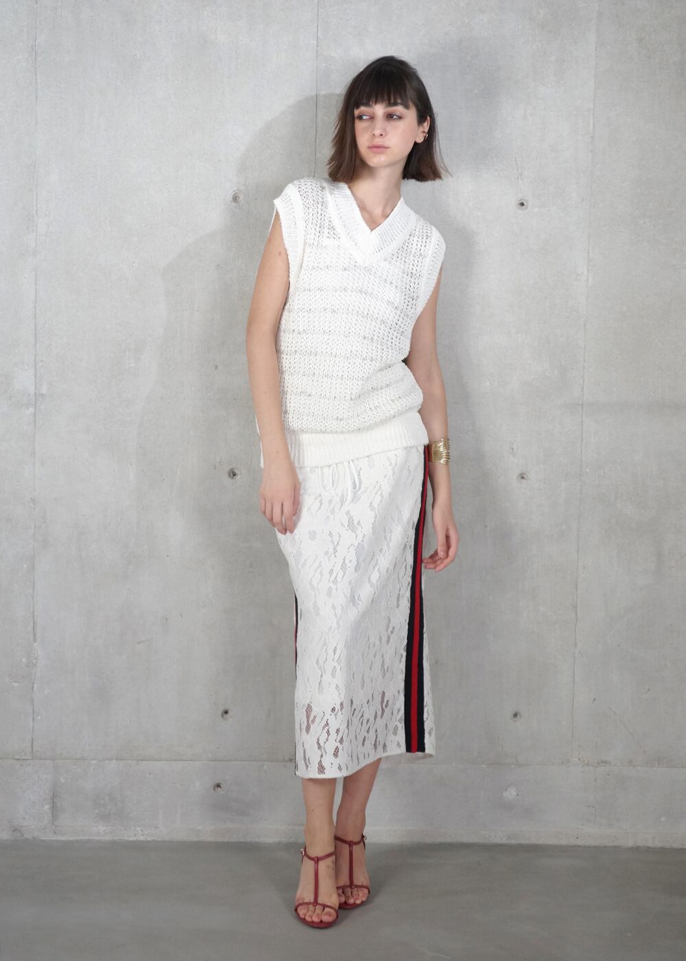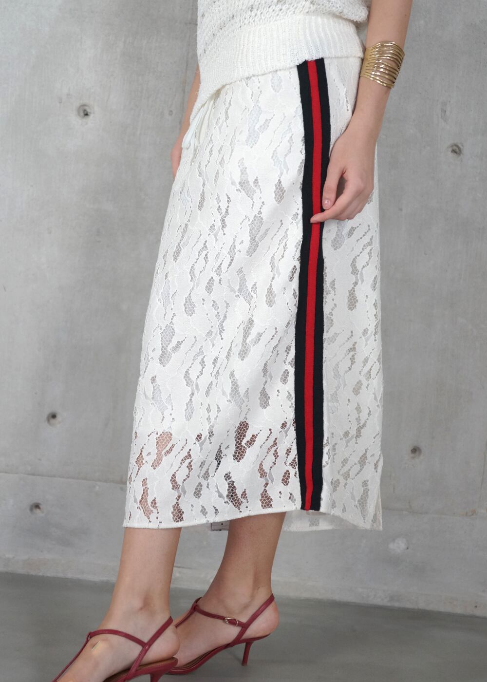 ニットの柔らかな表情に、抽象柄レースとスポーティーラインを重ね、異素材のメリハリで甘さを抑えた都会的な雰囲気に。