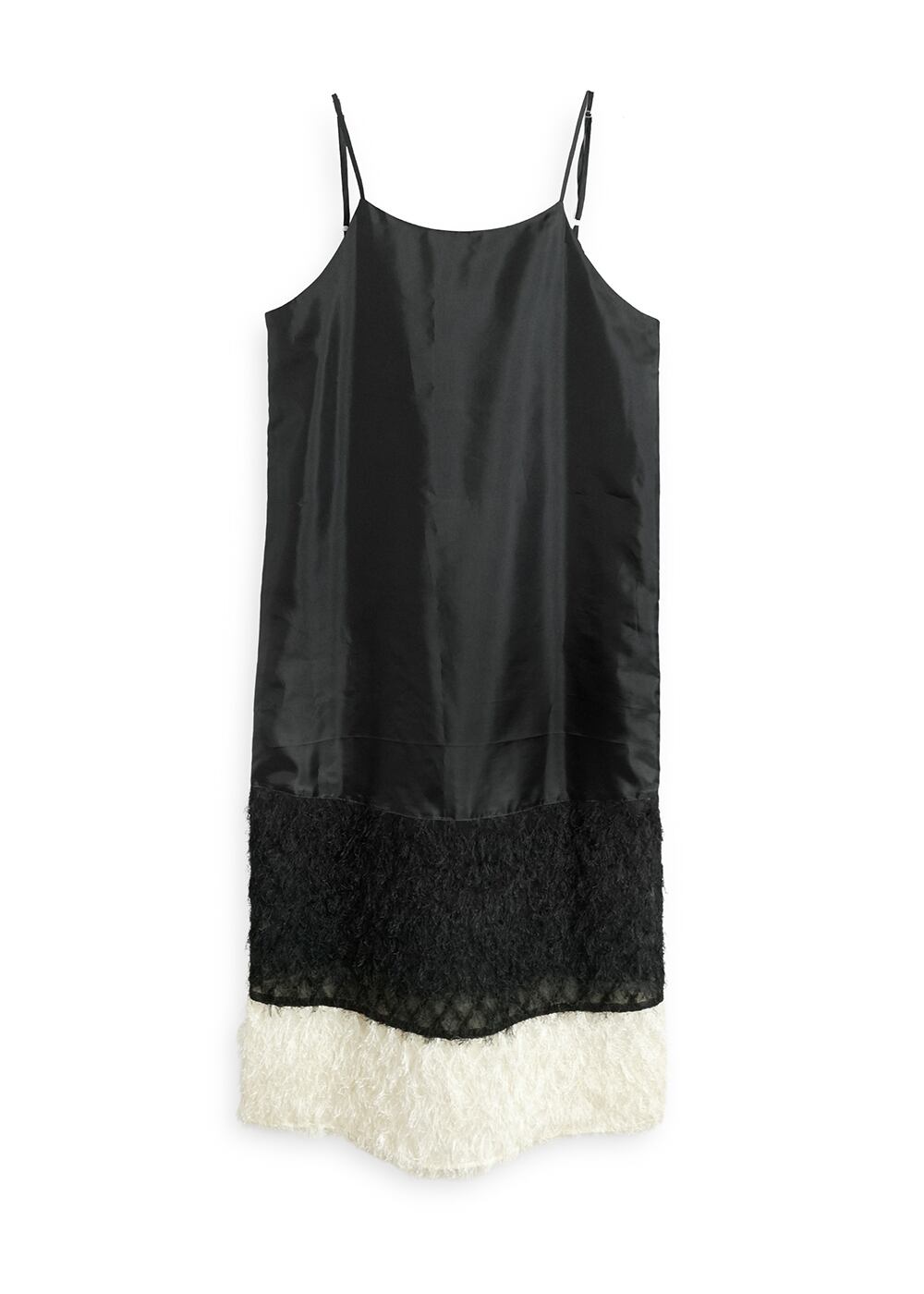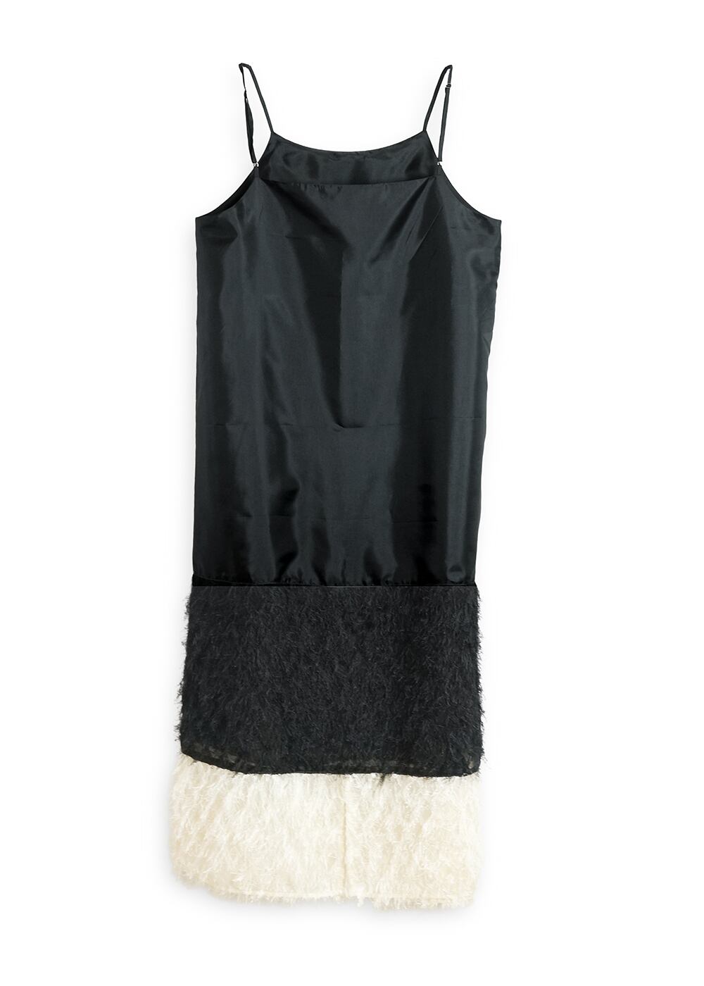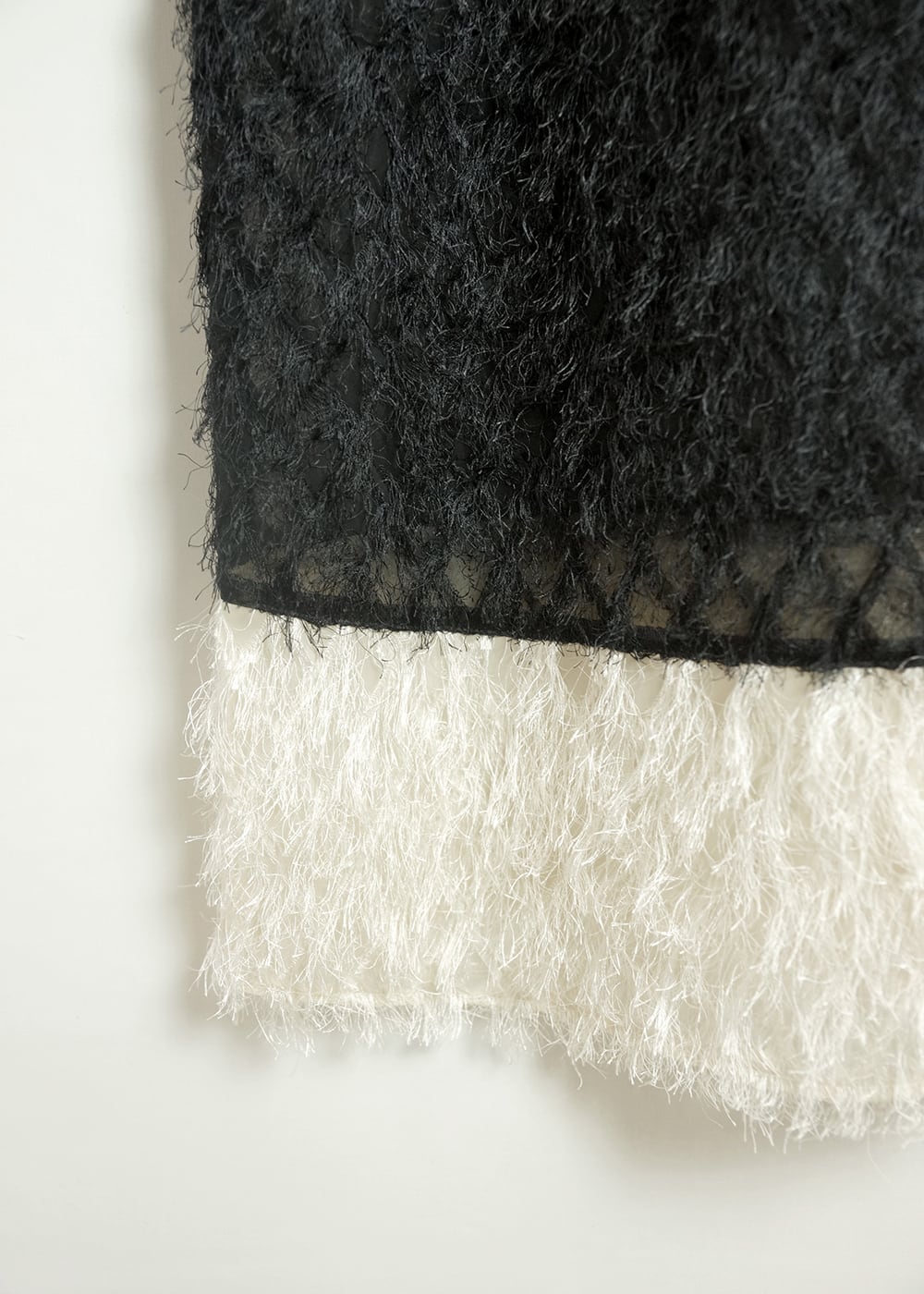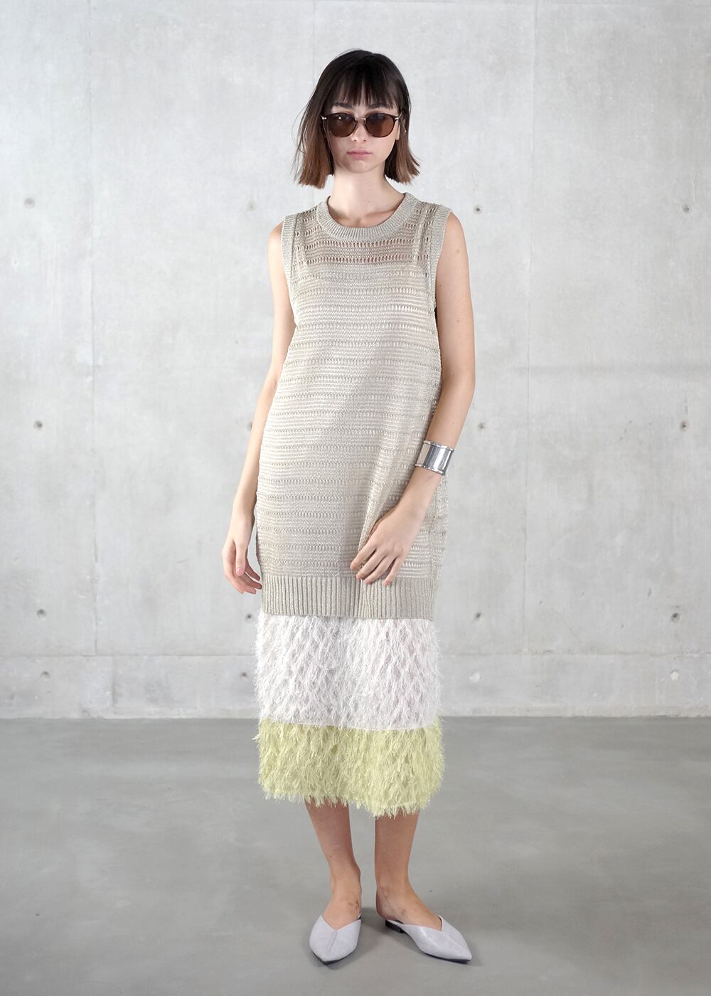 裾のカットジャガードは、キャミソールドレスにドッキングし、2色の奥行きをもたせることで裾に立体感とリズムを添える。