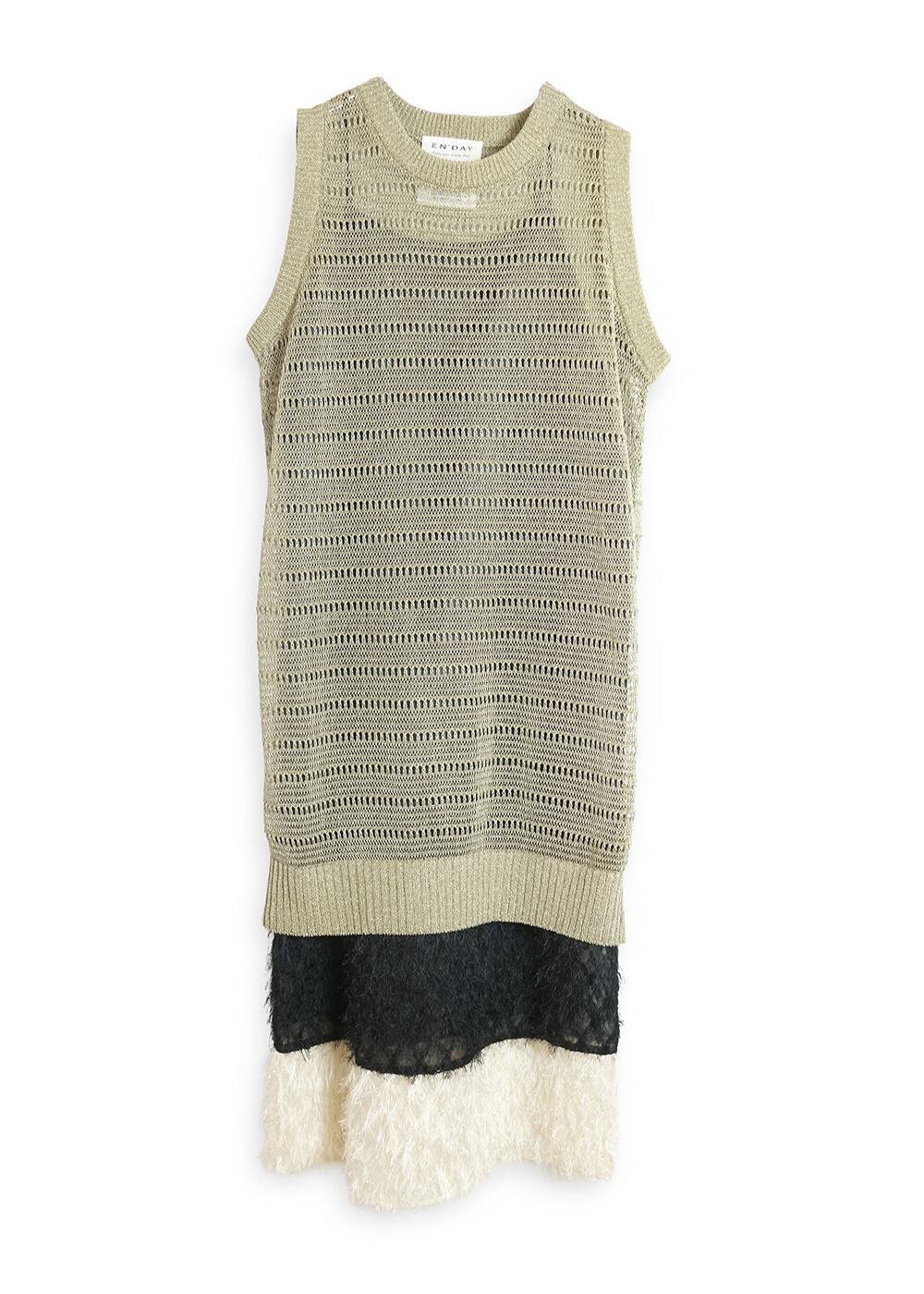 繊細な透かし柄のノースリニットの裾からのぞく、カットジャガードのカラーブロッキングが奥行きのあるレイヤードを描くワンピース。