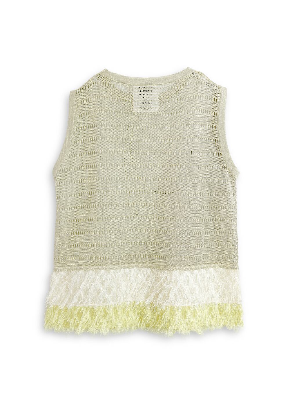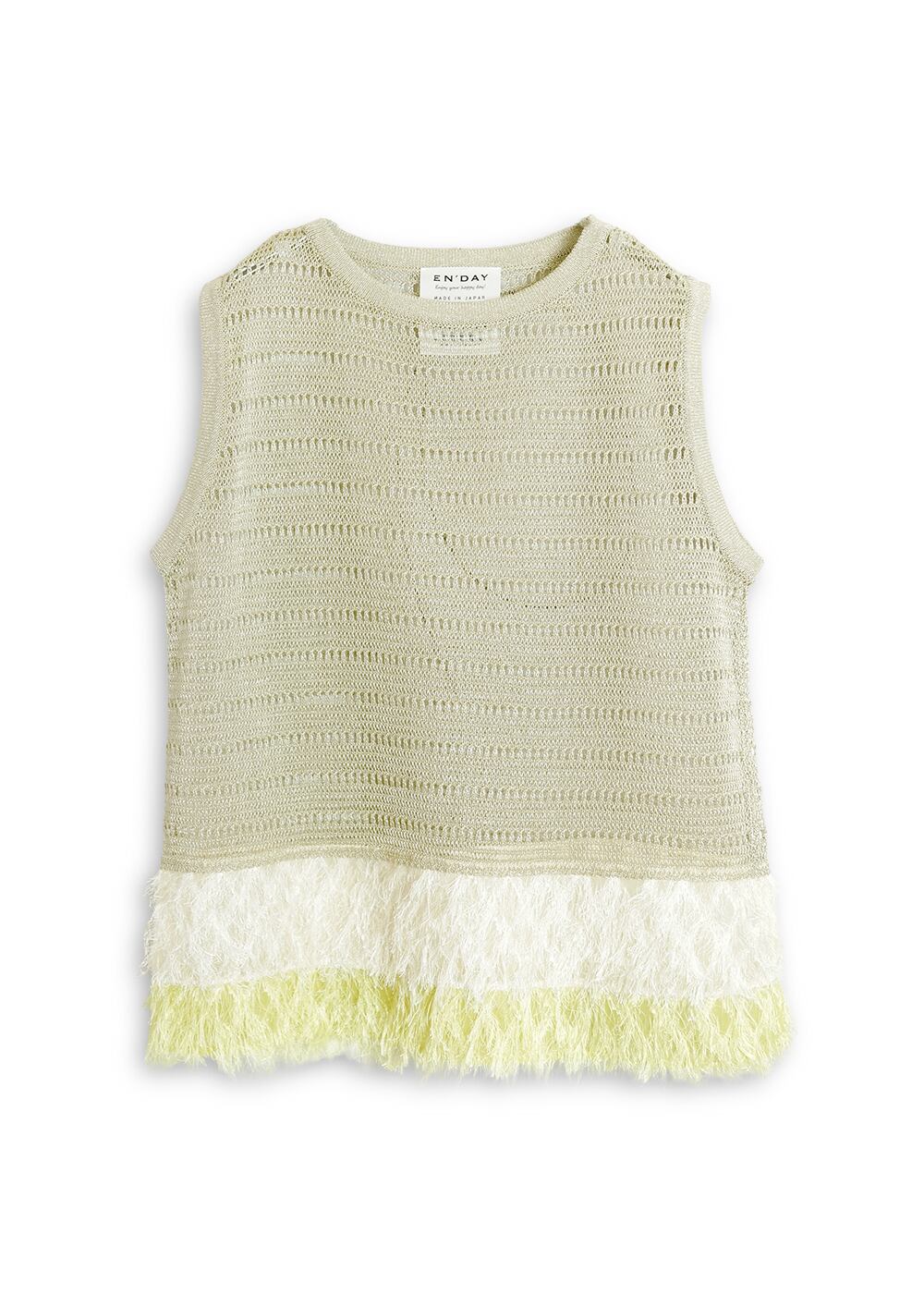 繊細な透かし柄のニットに、バイカラーのカットジャガードをドッキング。