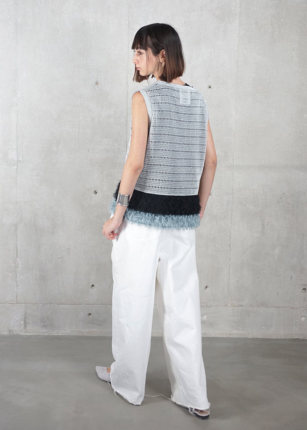 透け感とカットジャガードで描く、大人のレイヤードスタイル。