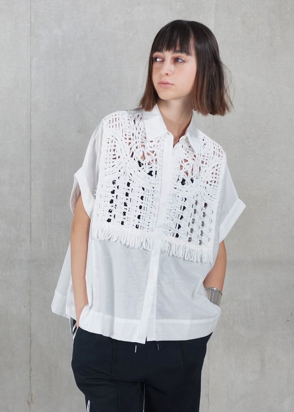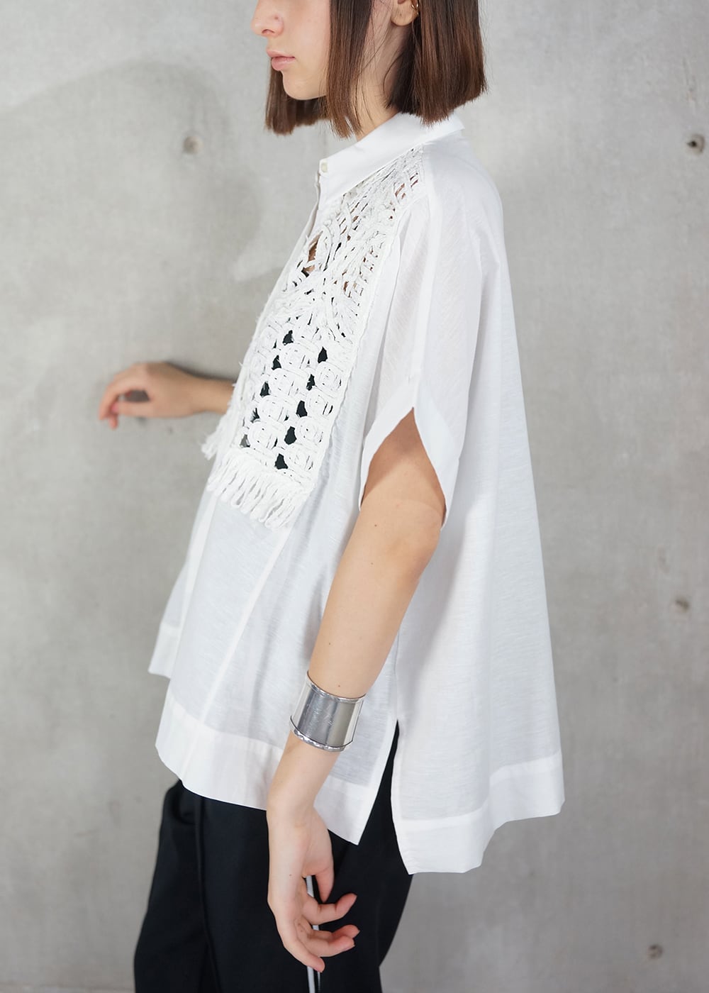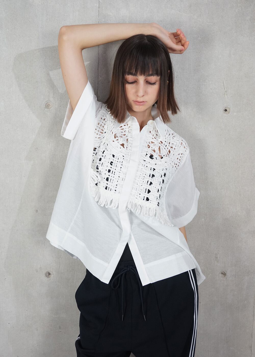 直線的なフォルムに 胸元だけを切り替えた透け感が、さりげない女らしさを添え、シンプルなコーディネートでも存在感を放ちます。
