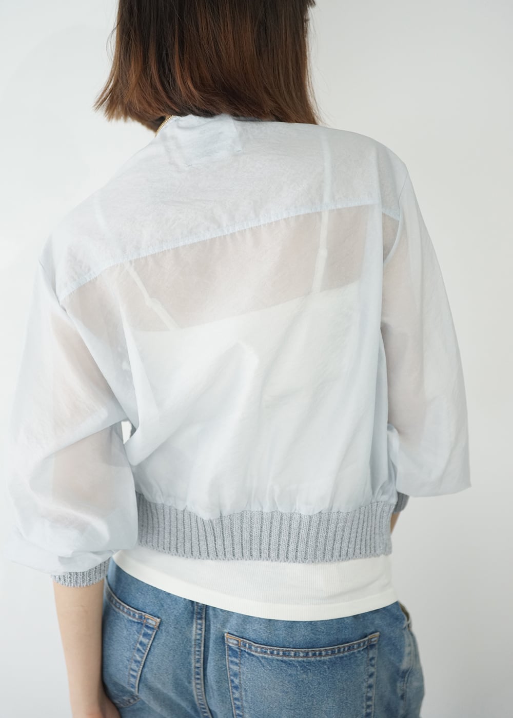 ・切り替えたブルゾン部分は、程よい透け感と上品な光沢を持つオーガンジー素材。ナチュラルな凹凸感を持ちつつ、シワになりにくい素材感が特徴。