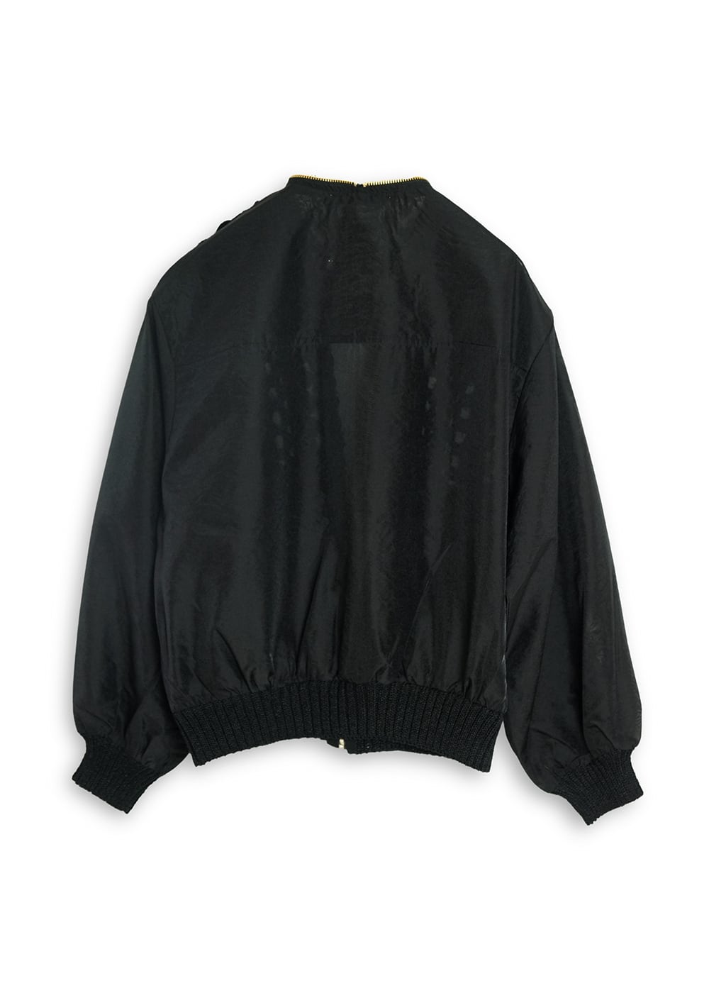 胸元のコード刺繍と柔らかに光を纏うオーガンジーが程よい甘さを演出し、ジップのシャープなラインが全体を引き締めることで、羽織るだけで洗練された存在感を放ちます。