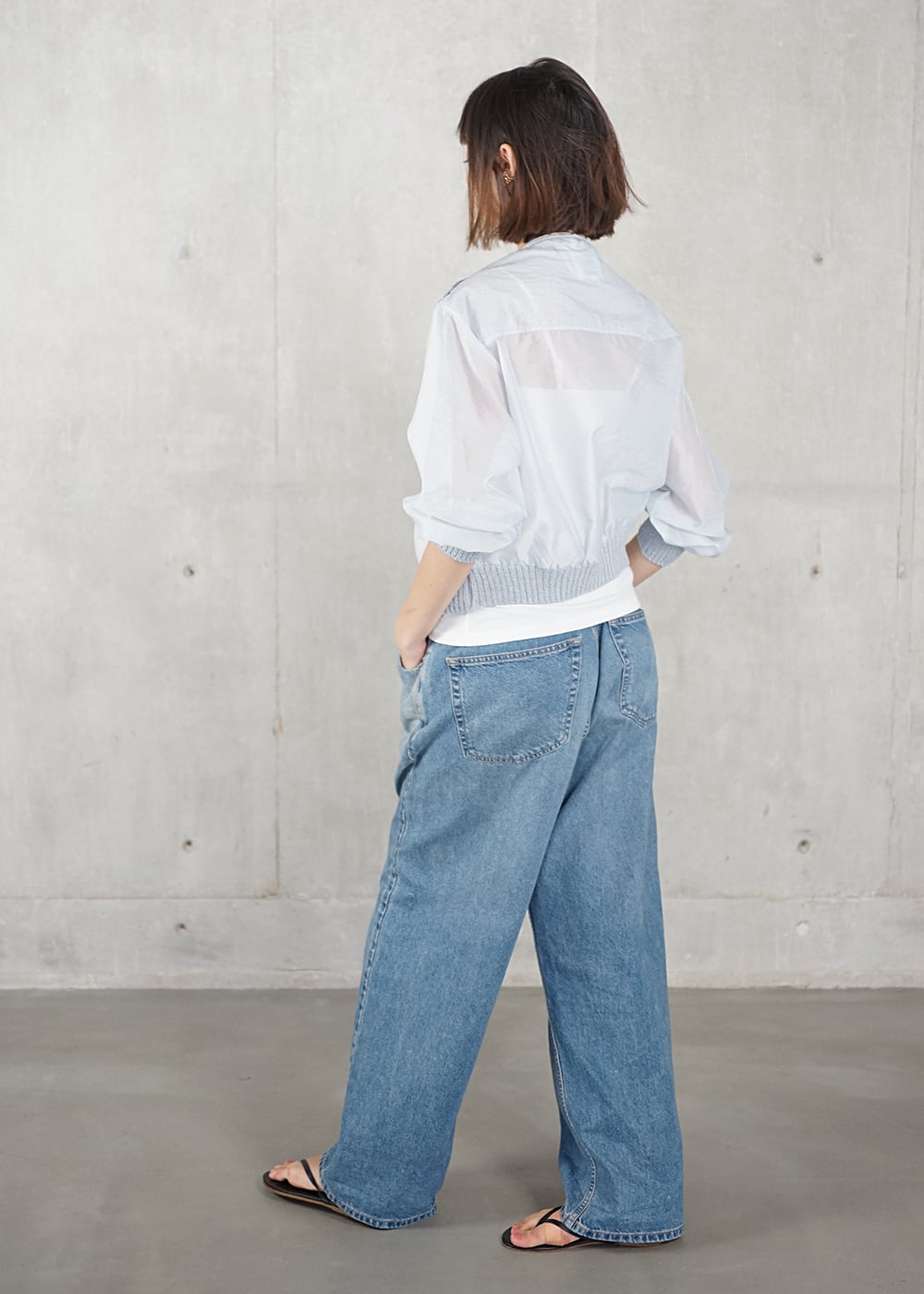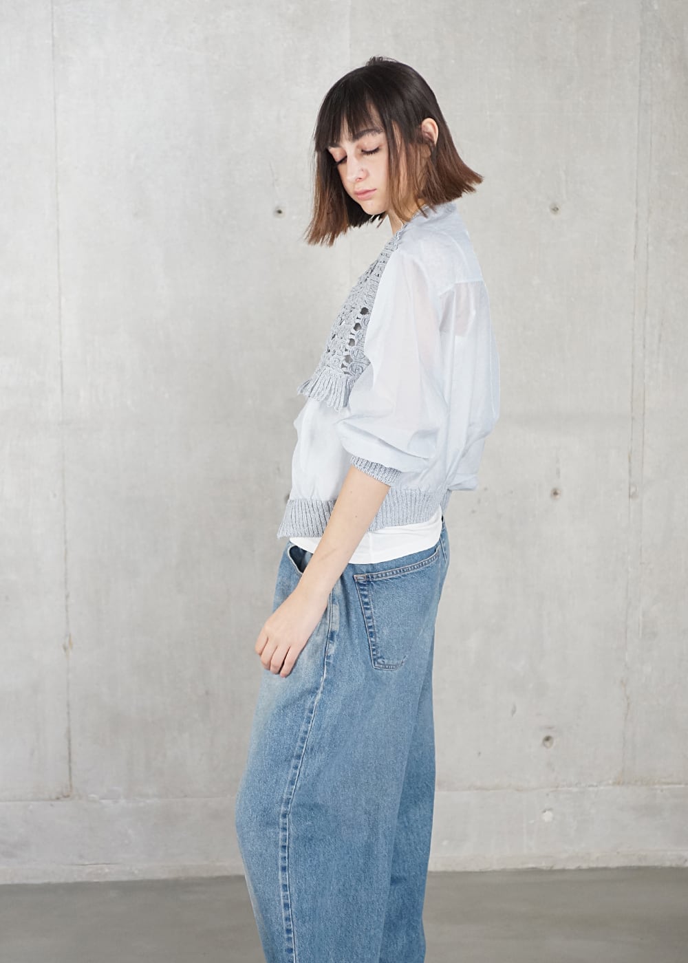 冷房の効いたオフィスでも快適に映え、スッキリとした着丈はワイドパンツやボリュームアイテムとも好相性。デニムを合わせるだけで、抜け感のある大人のスタイルが完成します。