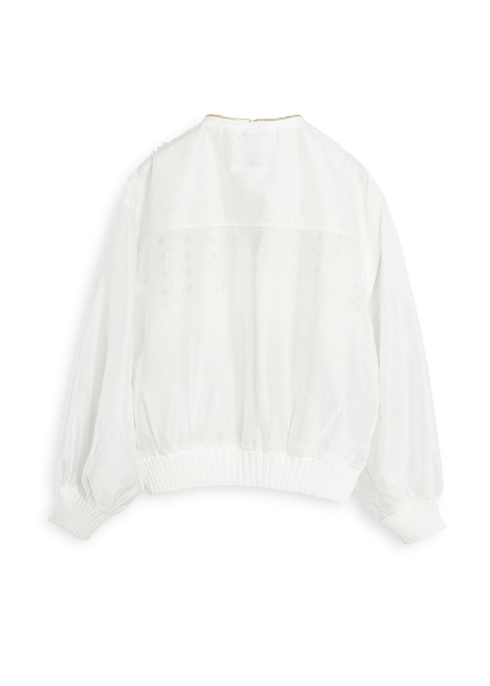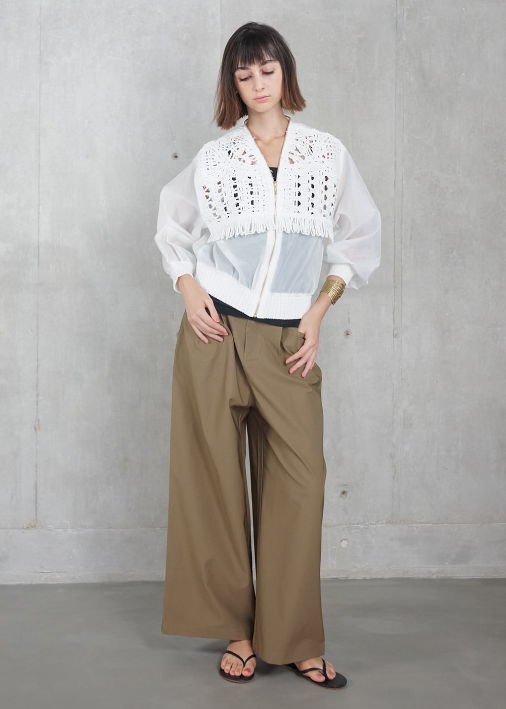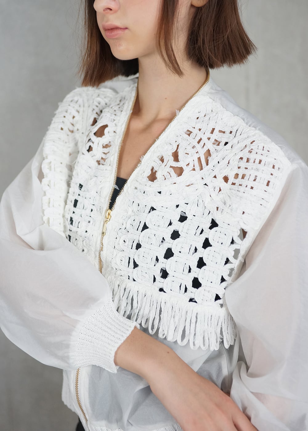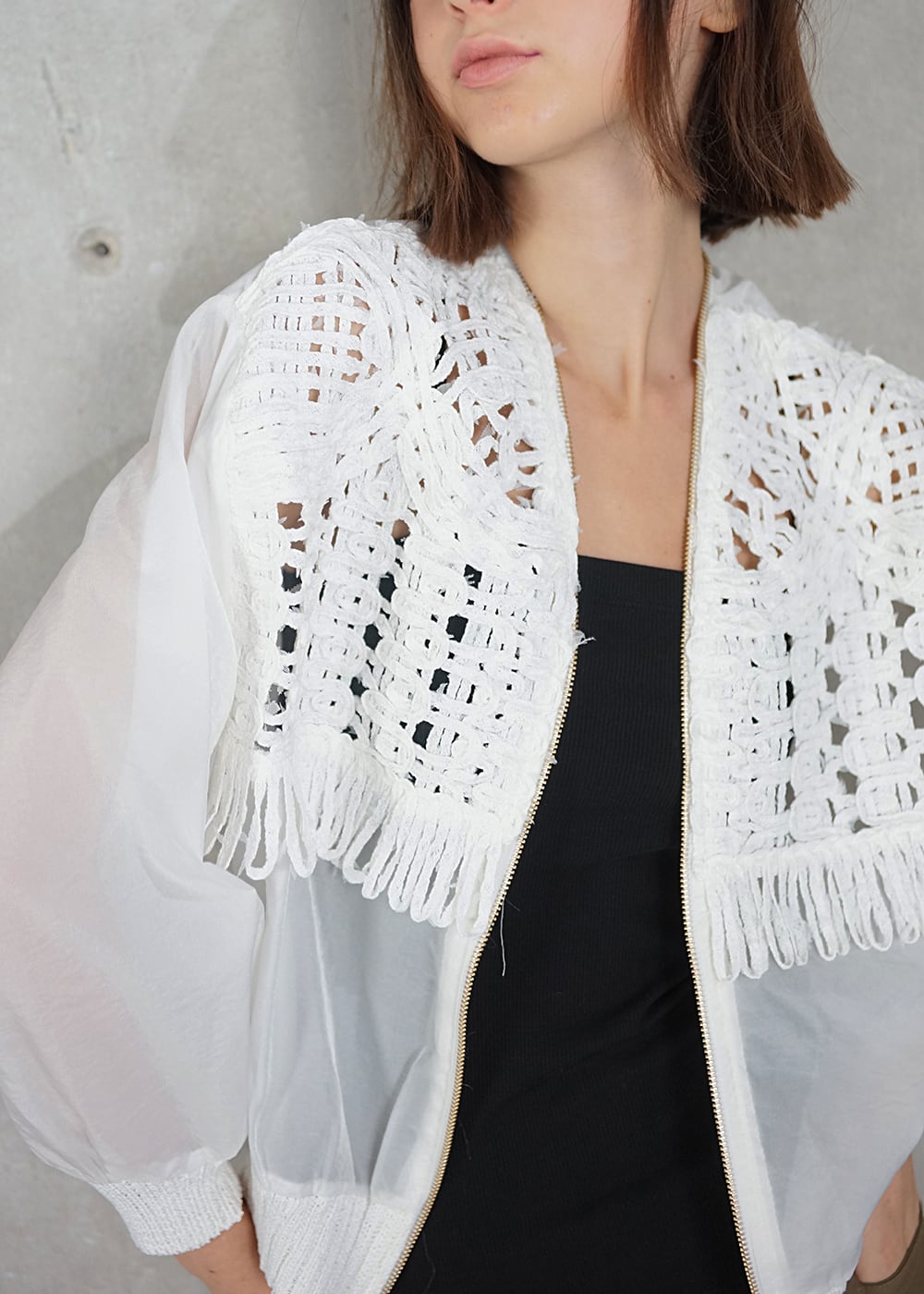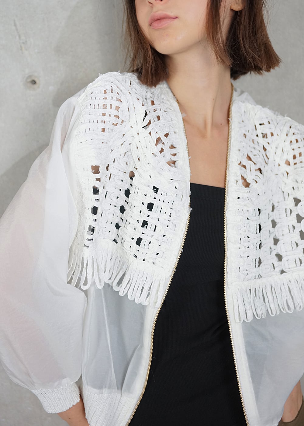 胸元のコード刺繍と柔らかに光を纏うオーガンジーが程よい甘さを演出し、ジップのシャープなラインが全体を引き締めることで、羽織るだけで洗練された存在感を放ちます。
