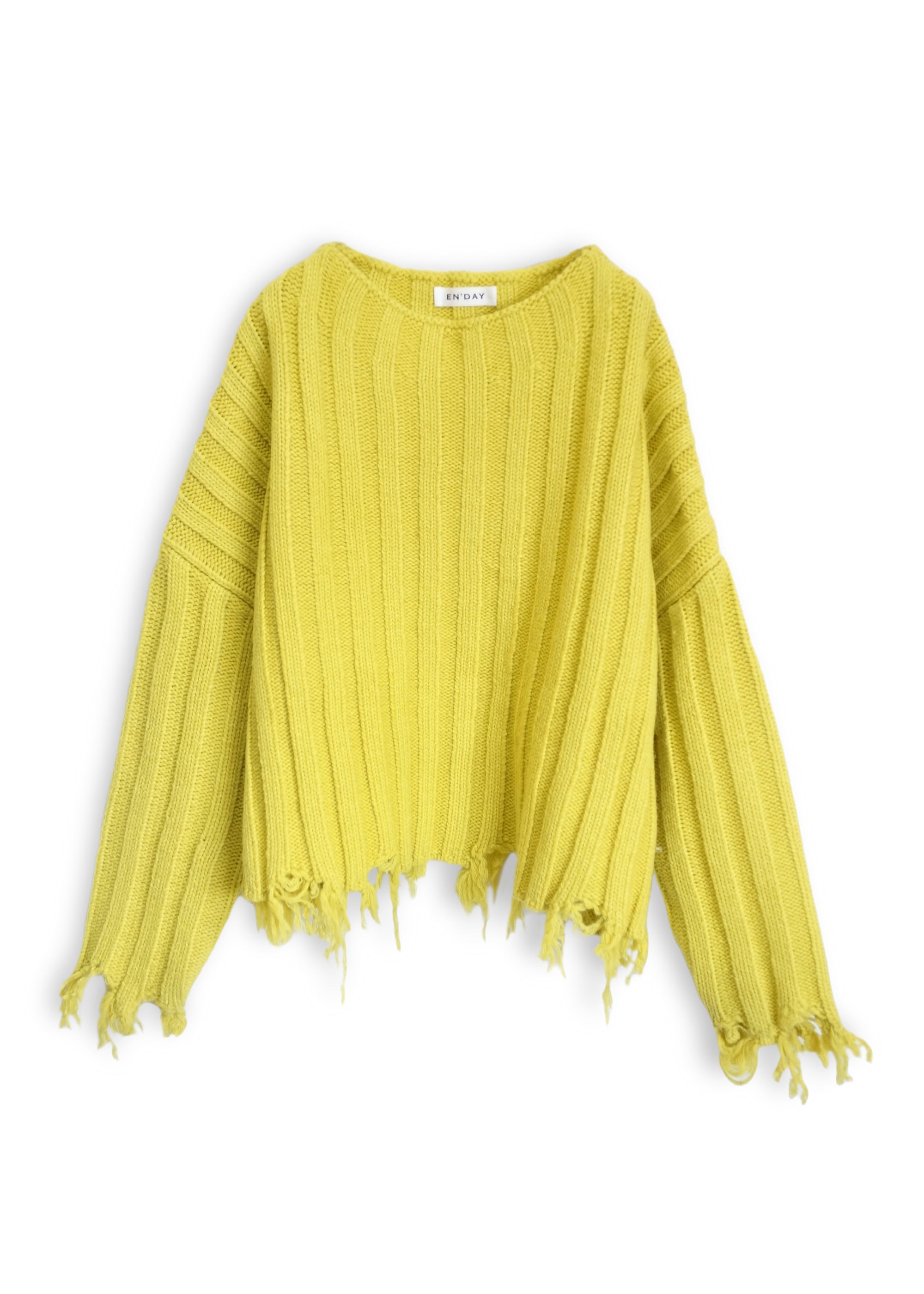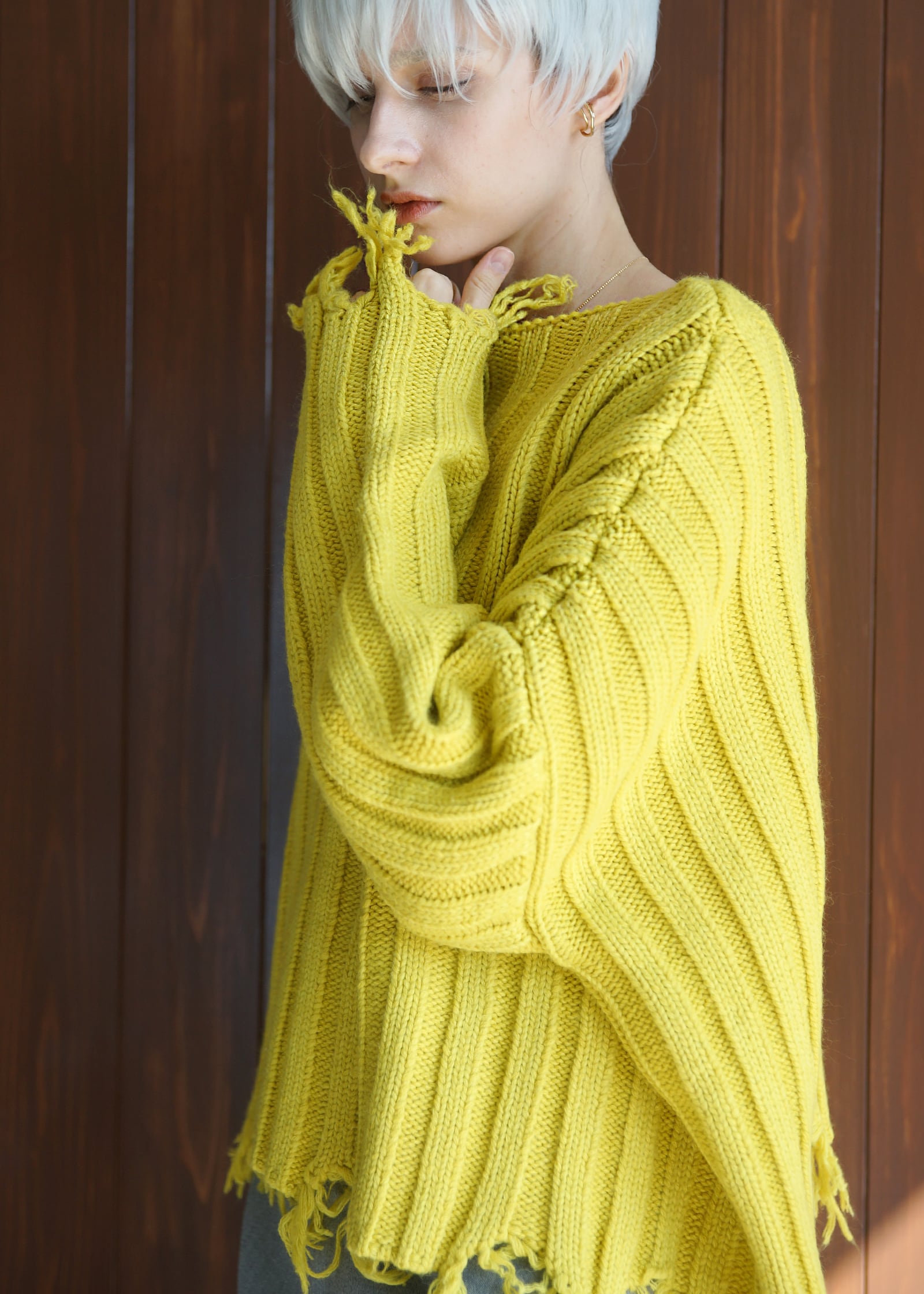 袖元と裾にはダメージ加工風の仕上げを施し、大人のグランジ感を漂わせるデザイン。