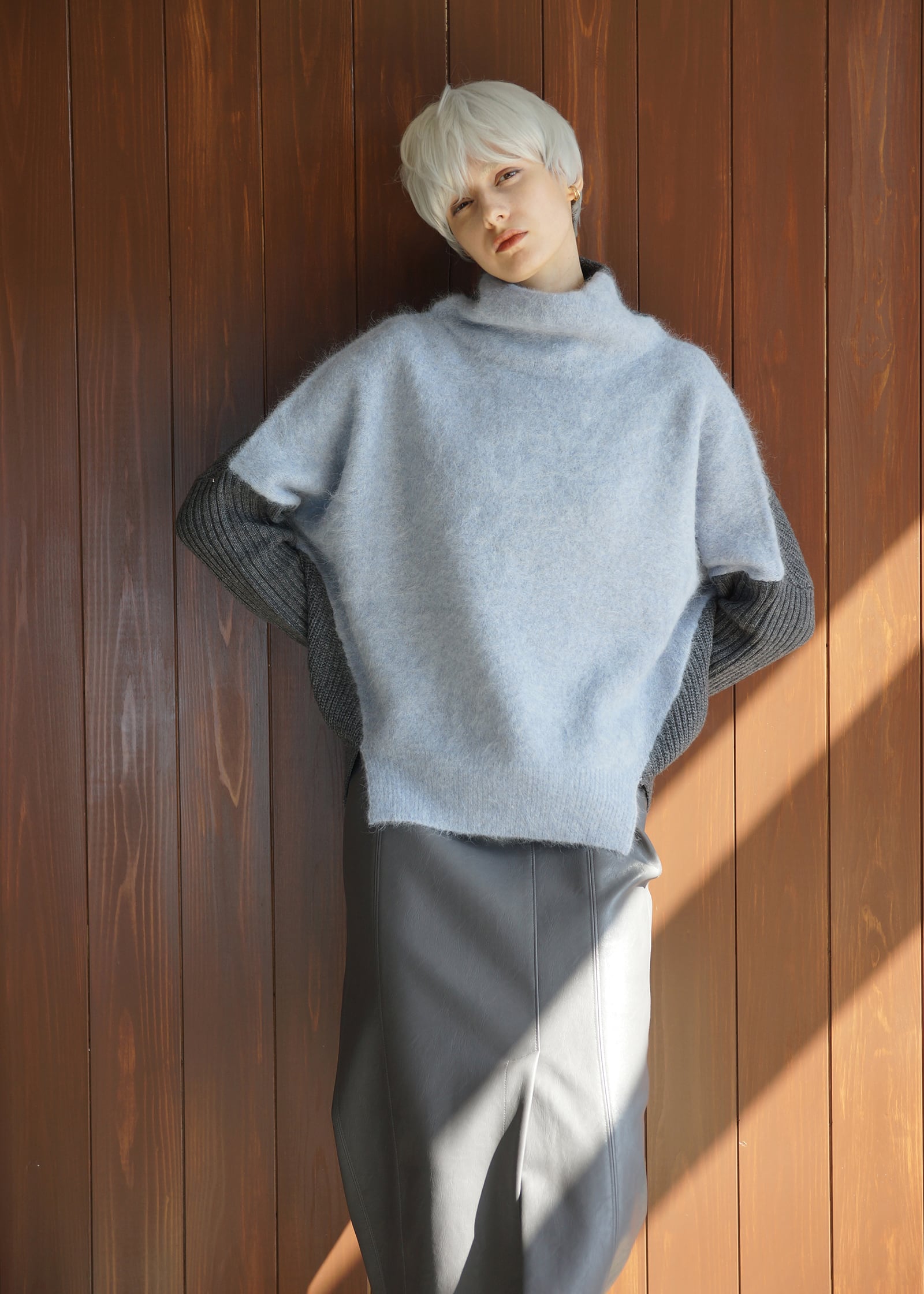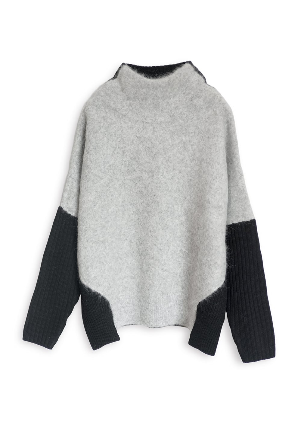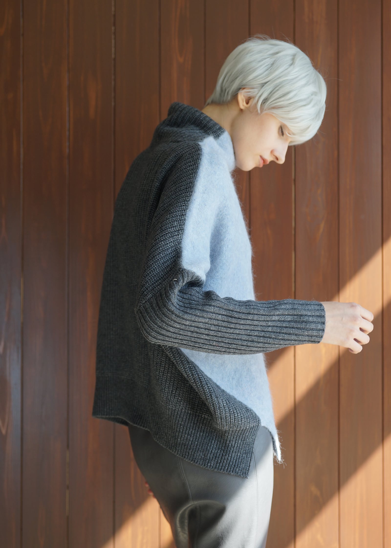 動くたびにドラマチックな表情を生み出すアルパカシャギーのカラーブロッキングニット。