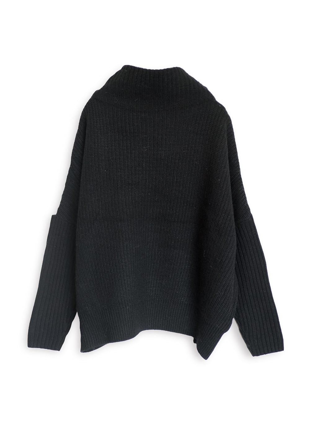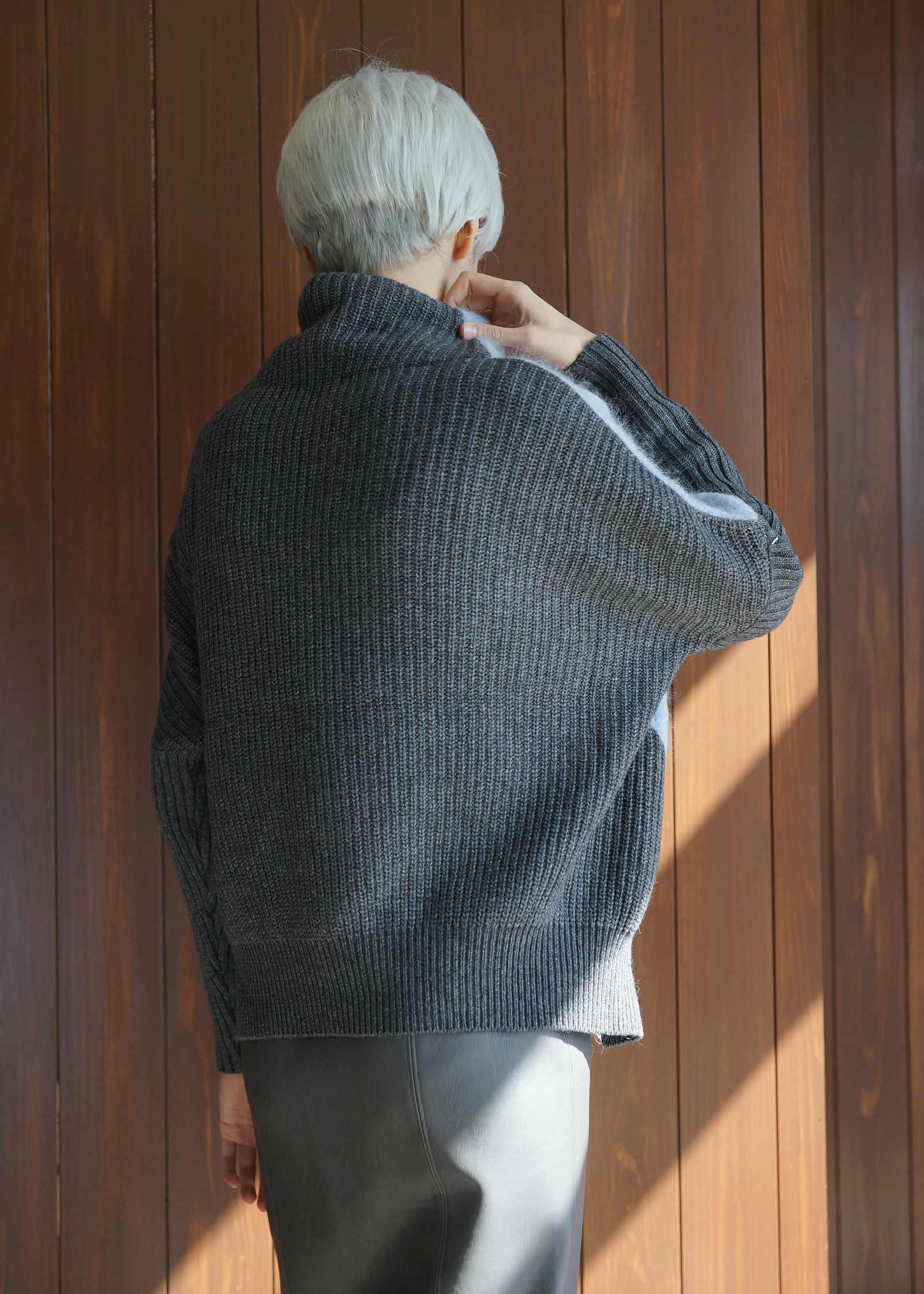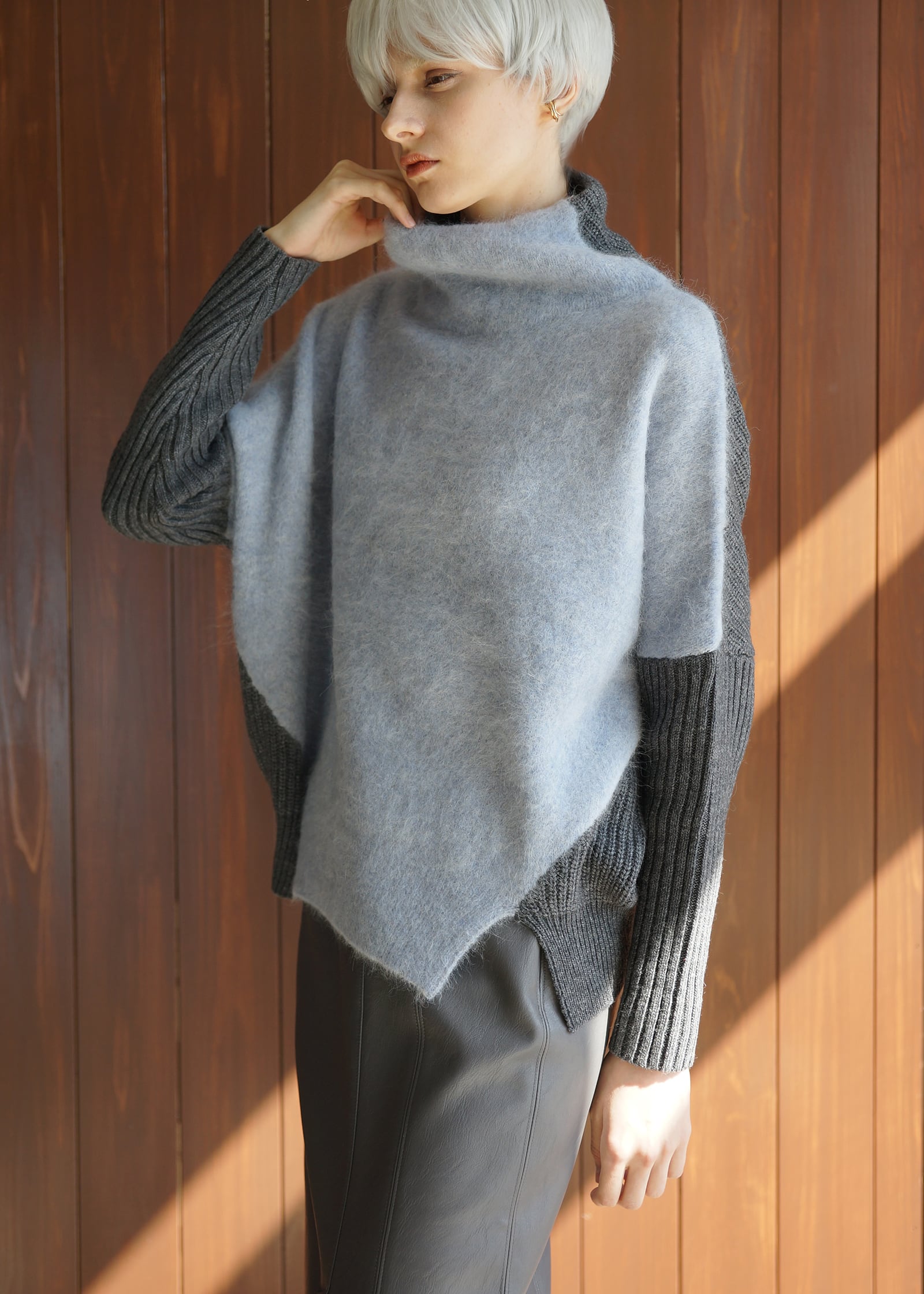 落ち感のあるリブ編みが、腕や背中をすっきりとシェイプしつつ、ポンチョ風のシルエットと絶妙なスリットが優雅な動きをプラス。