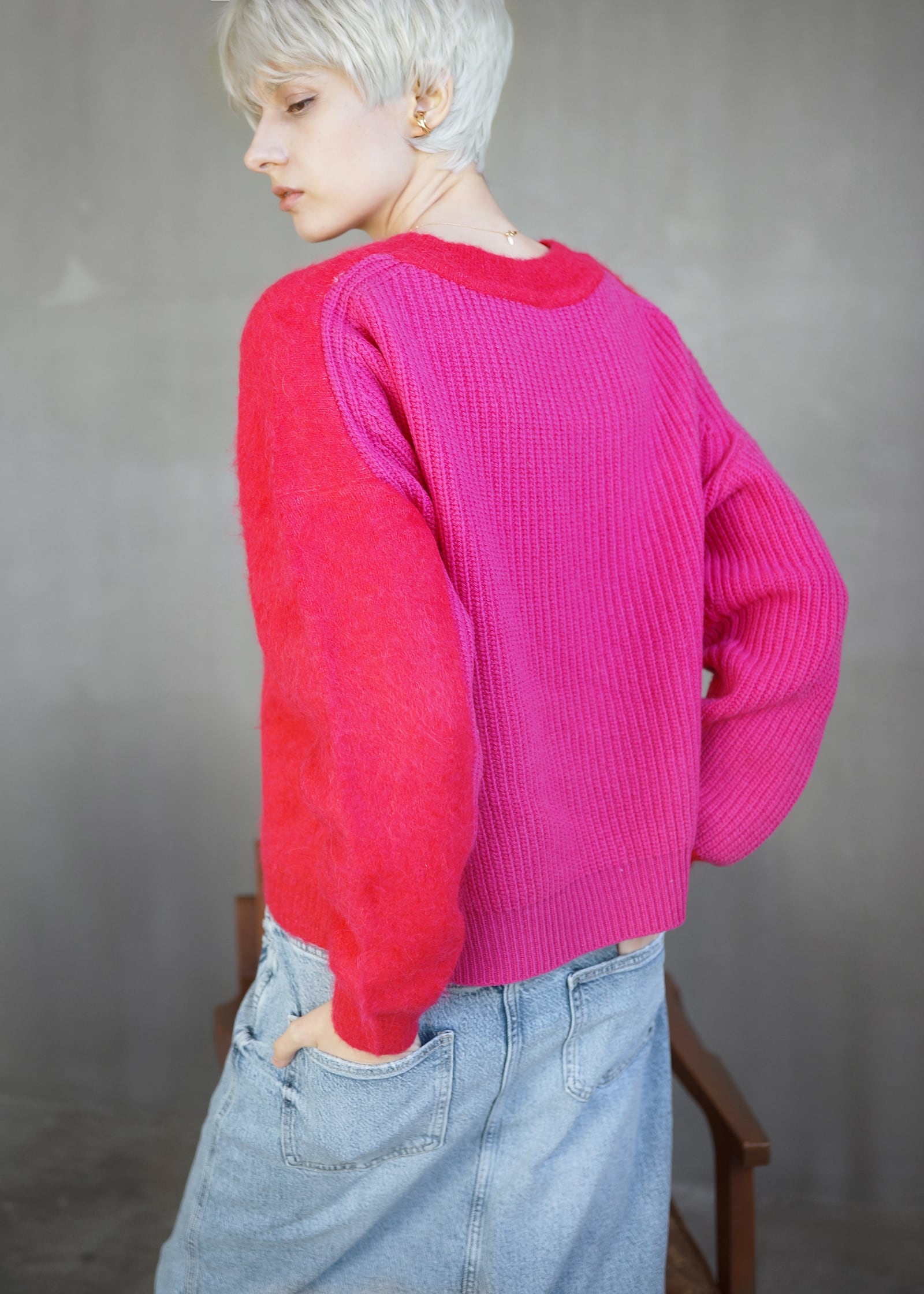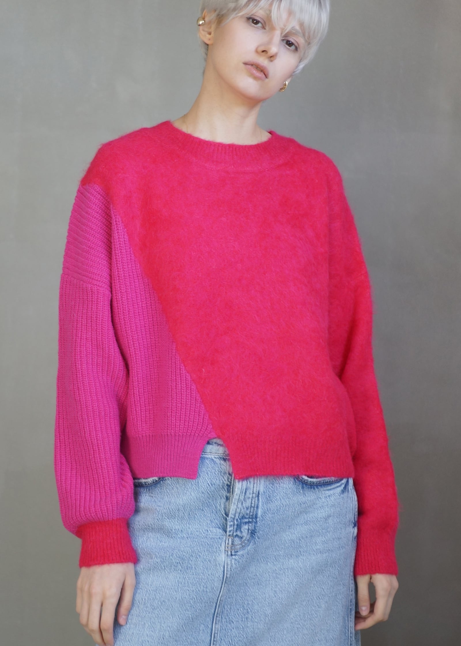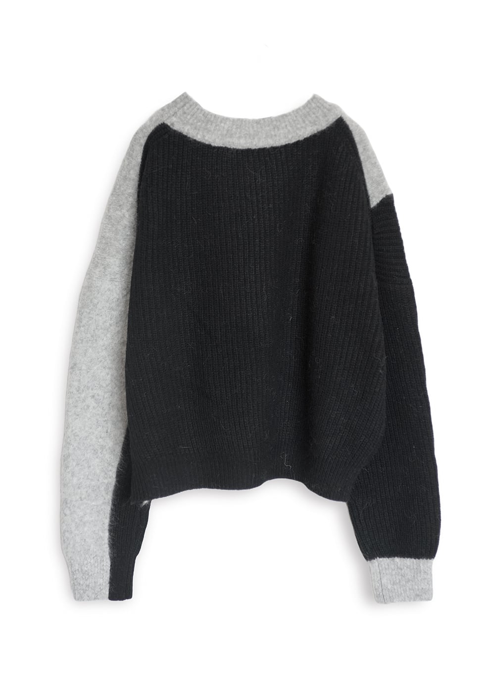 動くたびにドラマチックな表情を生み出すアルパカシャギーのカラーブロッキングニット。