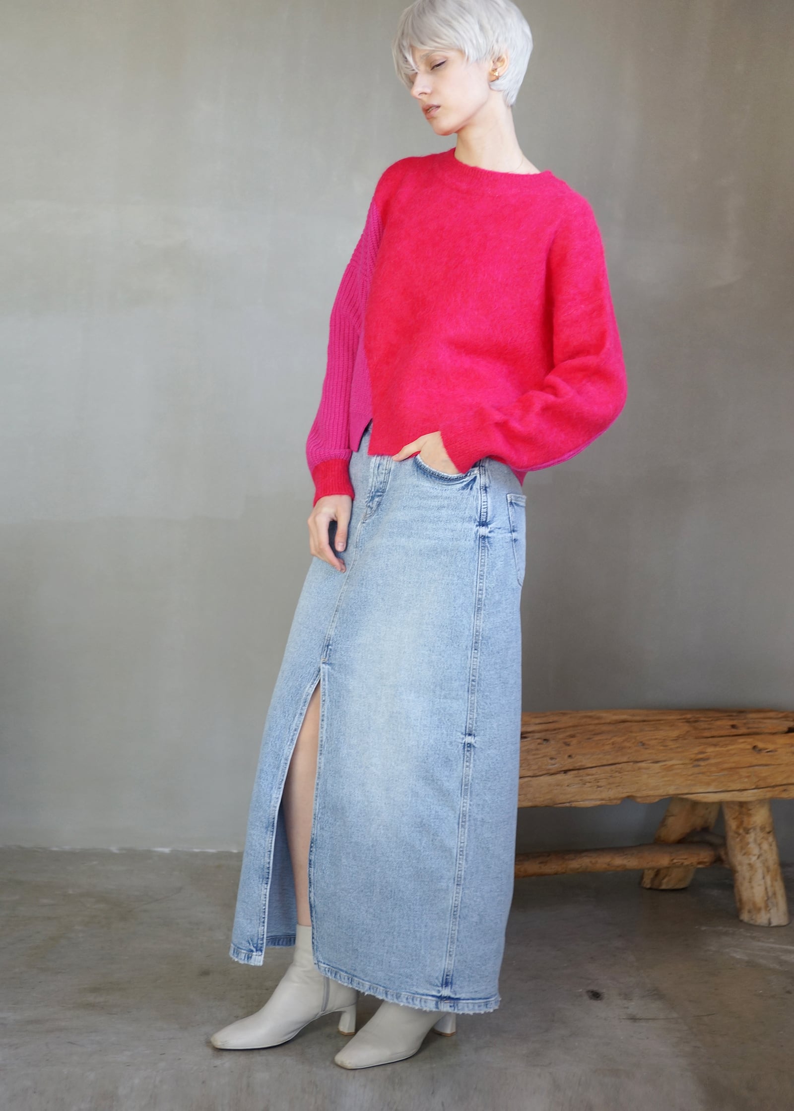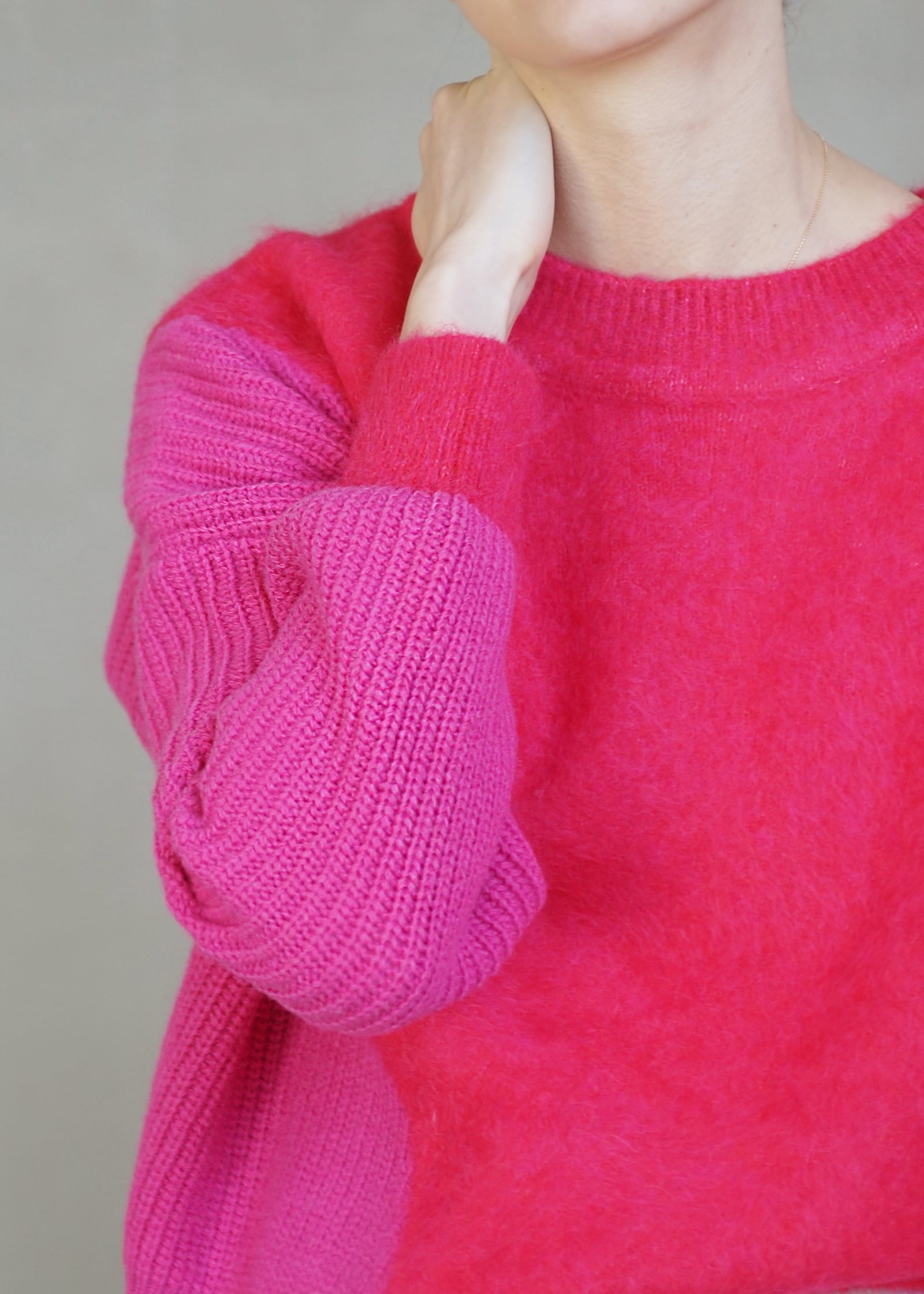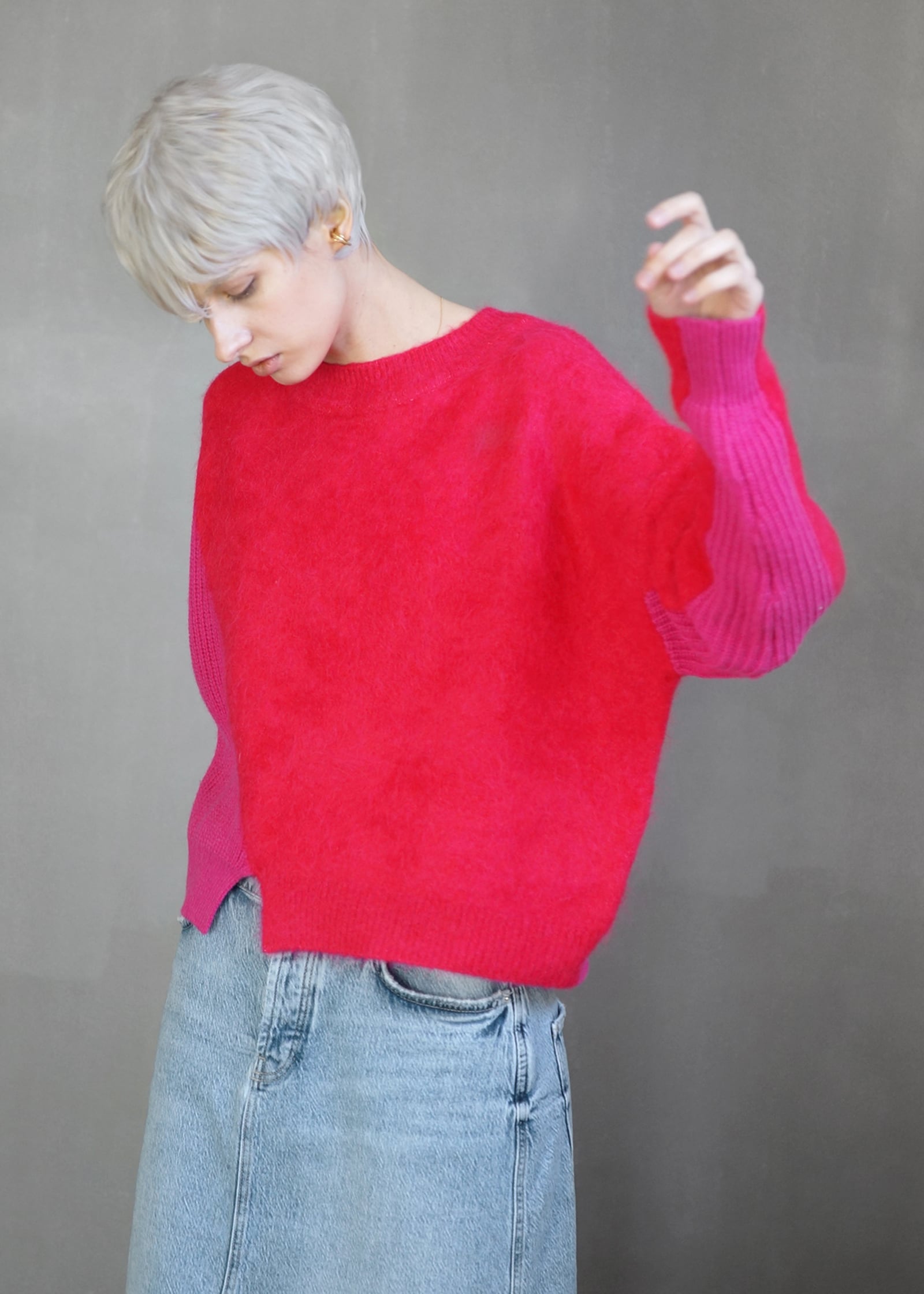 動くたびにドラマチックな表情を生み出すアルパカシャギーのカラーブロッキングニット。
